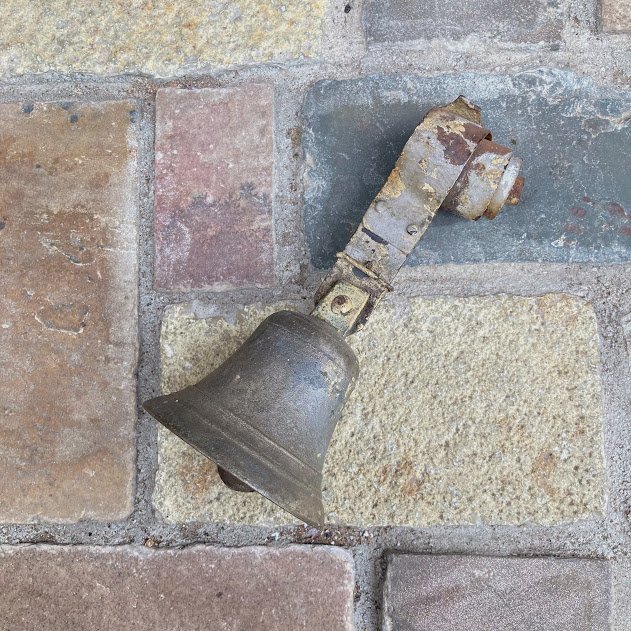 イギリスの貴族の館で使用人を呼び出すために部屋に設置されていた美しい音色のベル。推定1800年代とのこと。上部にくるくると巻き込んである部分にワイヤーのようなものを通して各部屋をつなぎ、音を鳴らして呼び出していたそうです。感じ方に個人差はありますが、鉄器の風鈴を力強くしたような音色です。音が気になる方には店舗から営業時間内に別途お送りすることもできますのでお気軽にお申し付けください。大きく響きますので、玄関やカウンターの呼び鈴などにもいいですね。サビに包まれていますが、独特の存在感に魅力を感じる方にはおすすめ。ピカピカの新品をお求めの方はご遠慮ください。福岡市南区の店舗にてお渡しもできますのでお気軽にどうぞ!