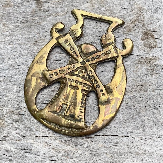 ホースブラス(HORSE BRASS)とは馬の額や首に飾るために使われていた真鍮製の飾りです。魔除けやラッキーアイテムとしてイギリスではパブや暖炉のそばに多く飾られています。ビクトリア時代には馬だけでなく、様々な動物、妖精、人物などのモチーフが作られました。重さがあるので、ペーパーウエイトとして使ったり、バッグにつけたり、家具にはめ込んだり、と自由な発想で楽しんでください。こちらは品番【43-183-H】windmillとなります。
