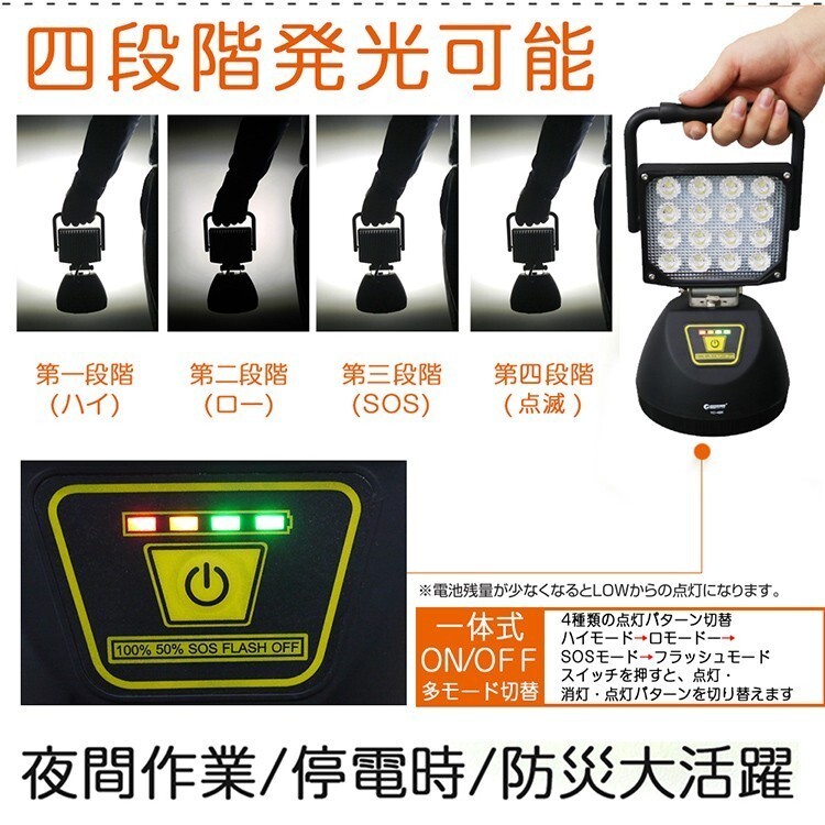 | 注意事項 | ※初めてご使用の場合や長時間ご使用にならなかった場合は、必ず充電してからご使用ください。 ※非常に明るいので直視は危険です! ※内蔵にある電池の切替ができますが、専門業者の指導のもとに操作しなければなりません。 | ||