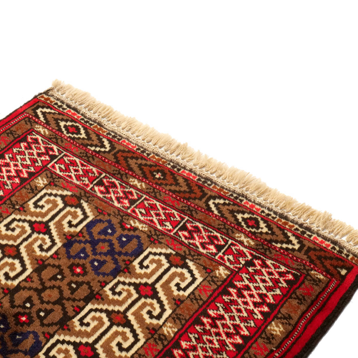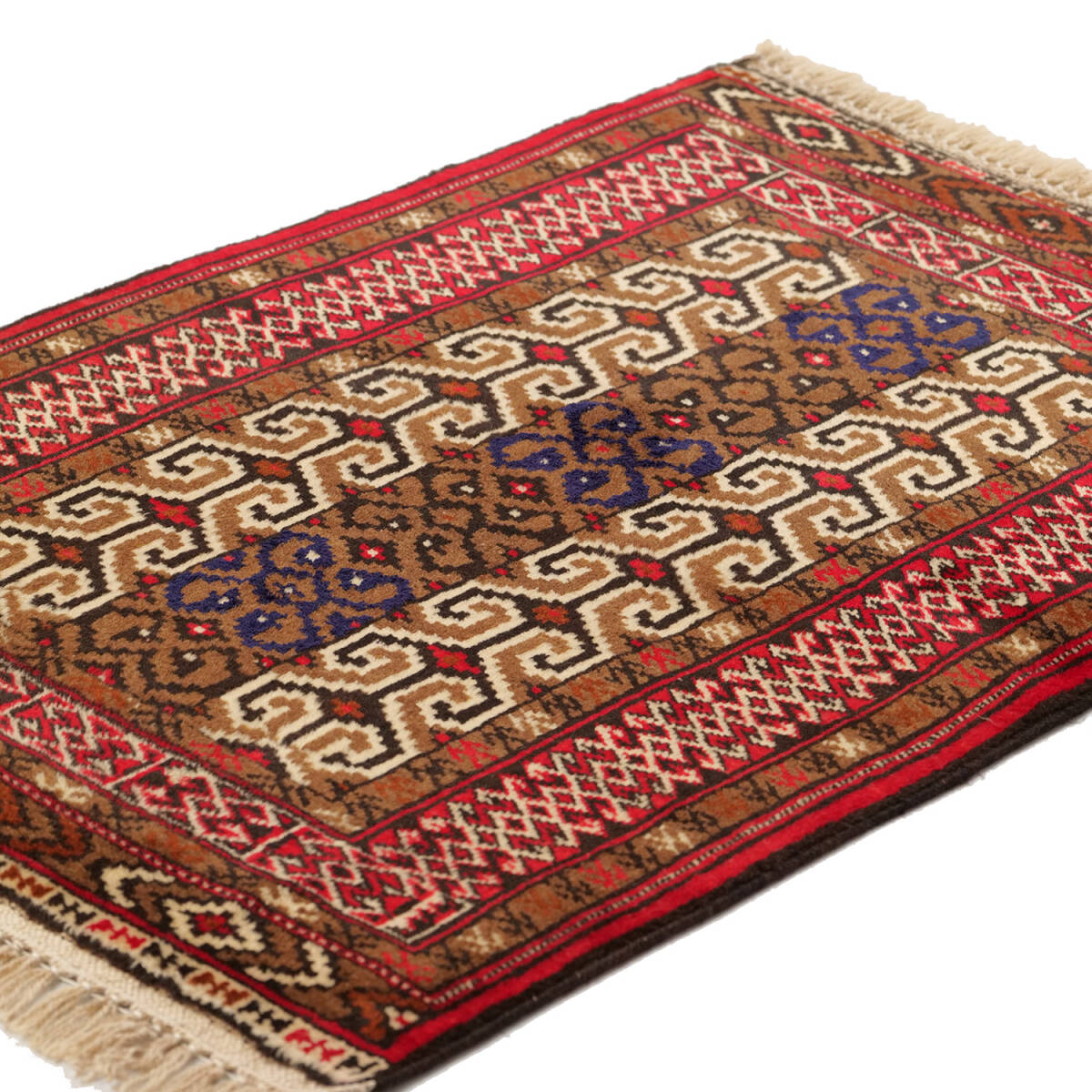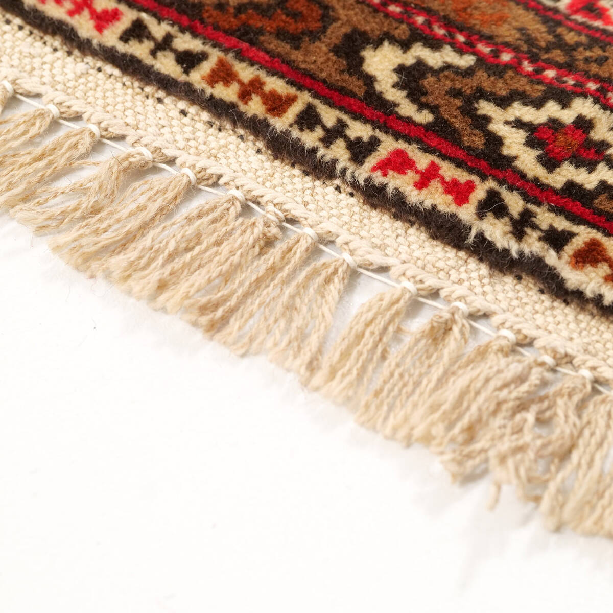 メアンダー文様は古代より連続する流れや永遠性を象徴する意匠として親しまれ、トルクメンの織りの中でも格式あるデザインとされています。落ち着いた色調の中に赤と生成りが映え、均整のとれた美しい構図を楽しめます。