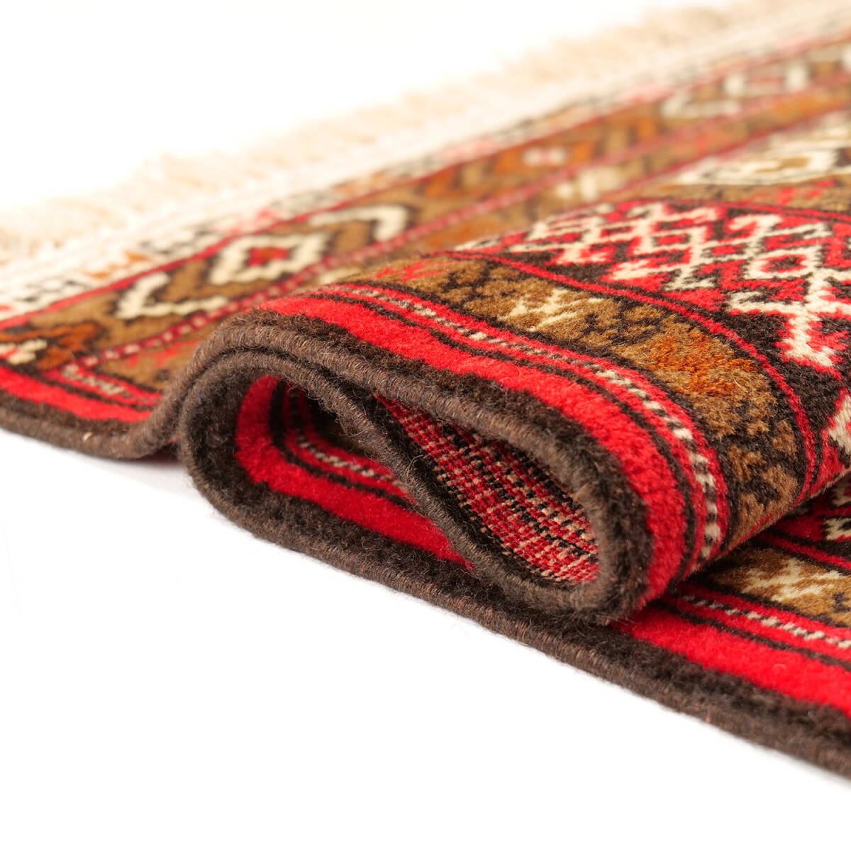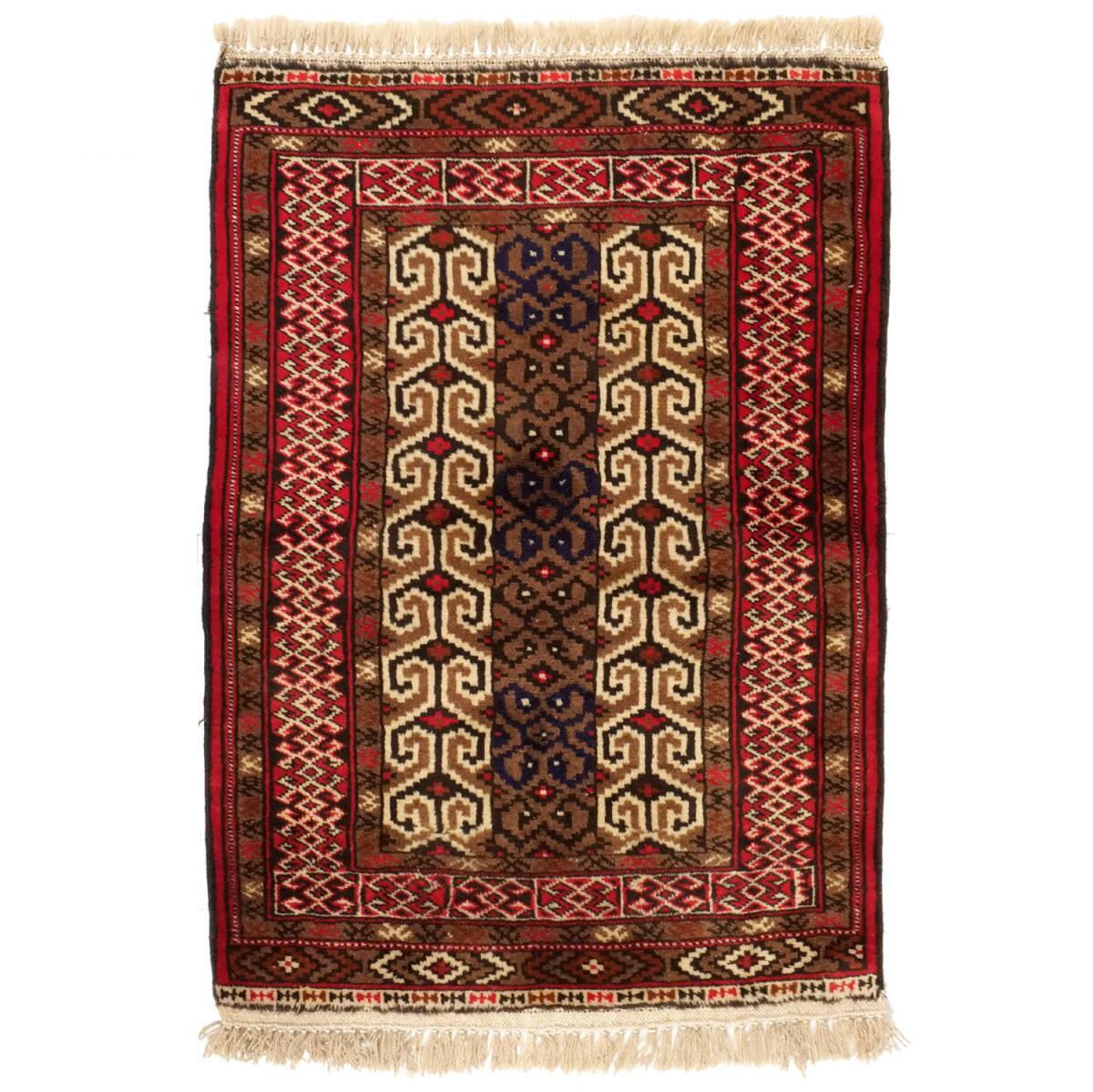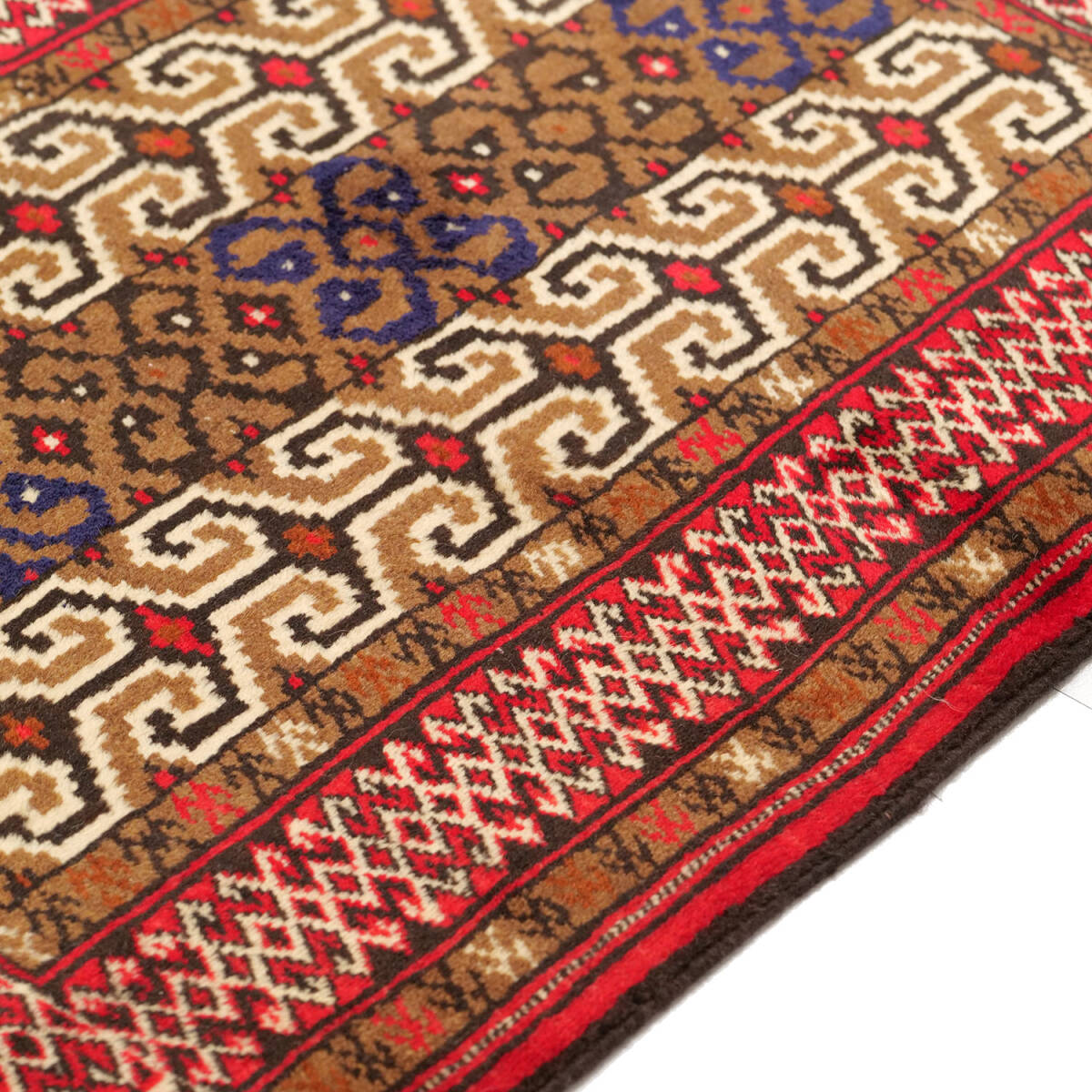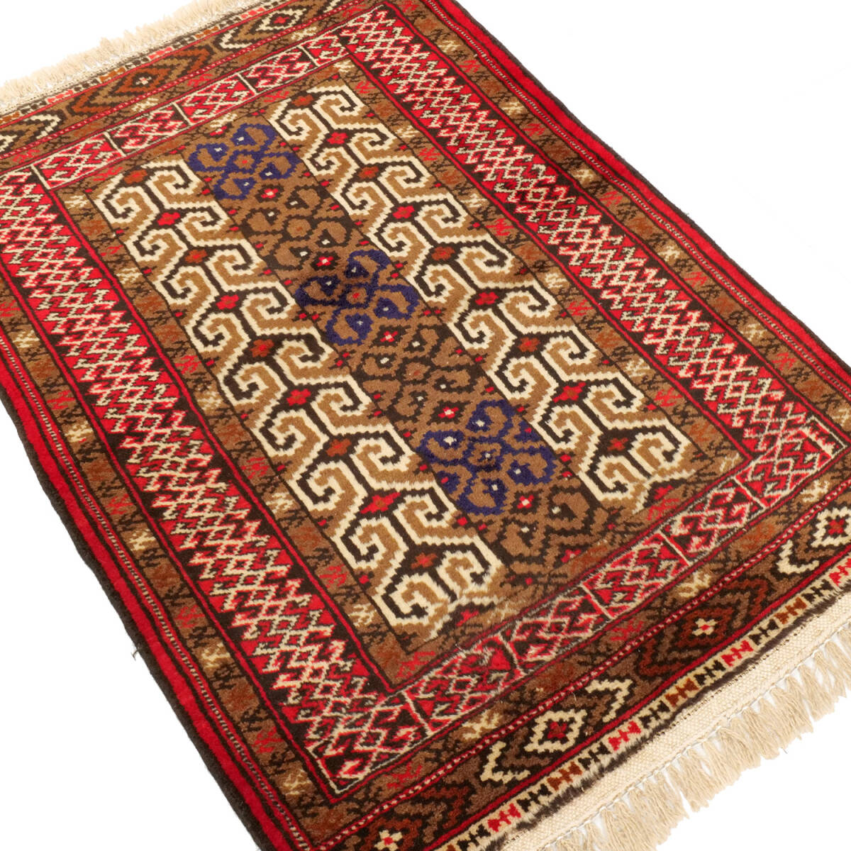 メアンダー文様は古代より連続する流れや永遠性を象徴する意匠として親しまれ、トルクメンの織りの中でも格式あるデザインとされています。落ち着いた色調の中に赤と生成りが映え、均整のとれた美しい構図を楽しめます。