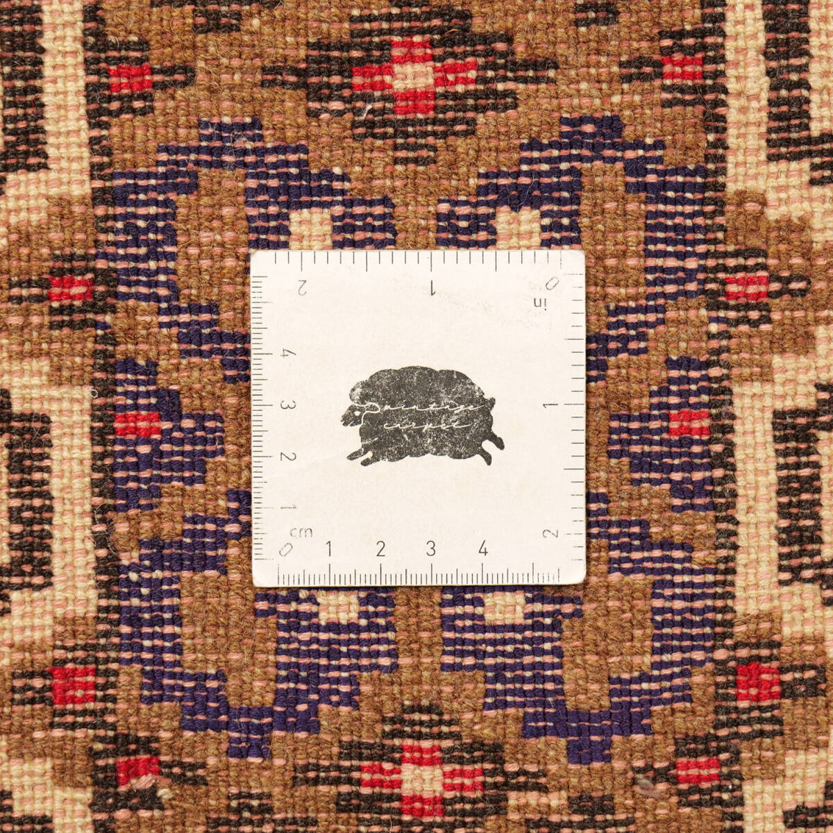 1980年代に制作されたトルクメン産のセミアンティークラグです。中央には連続するメアンダー文様が整然と配置され、力強い幾何構成の中に柔らかさを感じさせる仕上がりです。縁取りには菱形や格子のパターンが織り込まれ、全体に立体的な奥行きが生まれています。