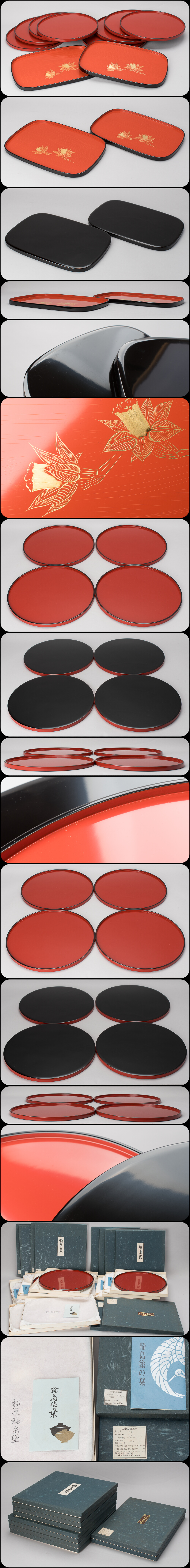 | 輪島塗の卓上膳10枚。元箱有。 丸盆がサイズ違い2種・各4枚と、沈金のものが2枚。 もちろん、本木地・本漆塗で、沈金は手彫りで本金が使われています。 サイズは丸盆大が、幅約32cm、高さ約1.5cm。 丸盆小が、幅約30.5cm、高さ約1.5cm。 沈金盆が、幅約36.5x26cm、高さ約2cm。 10枚すべて傷・直し・ヤケ・歪み等ありません。 多少のスレありますが、状態良好です。 状態・詳細は、画像でご確認お願いいたします。 |