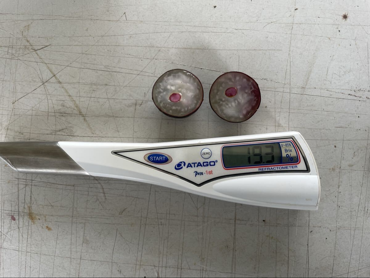 他の品種に比べ果実の完熟の判断がすこし難しいです。真っ黒に色付いても完熟ではありません、未熟な時は皮が厚いためハリがあるうちには収穫せず、少し柔らかくなってから収穫して下さい。完熟で食べると食べ応えもあり他の品種と食味は変わりません。