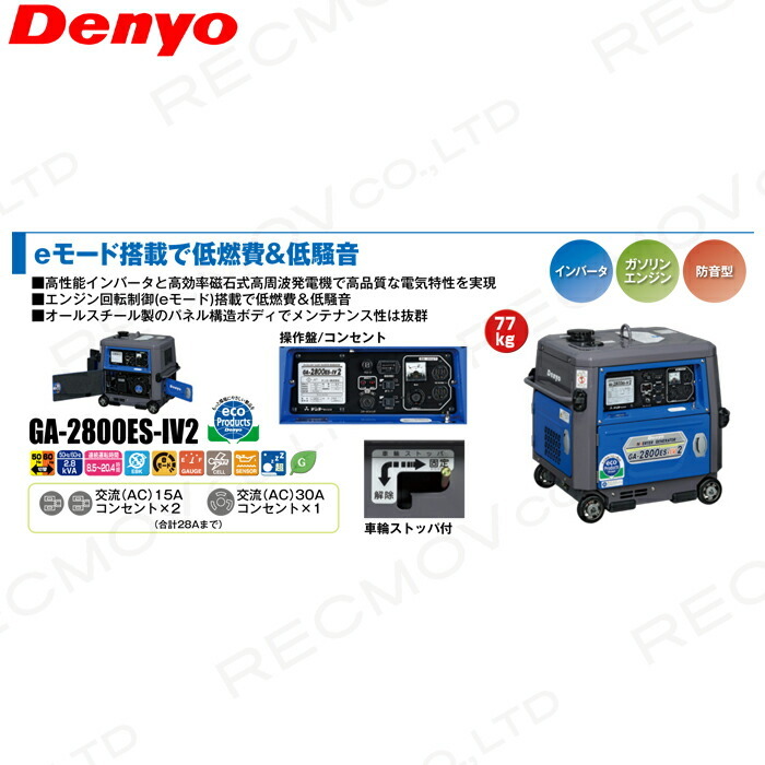 受注生産 納期別途ご案内 デンヨー インバーター発電機 GA-2800ES-IV2 2800W 2.8kVA インバータ発電機 ガソリンエンジン