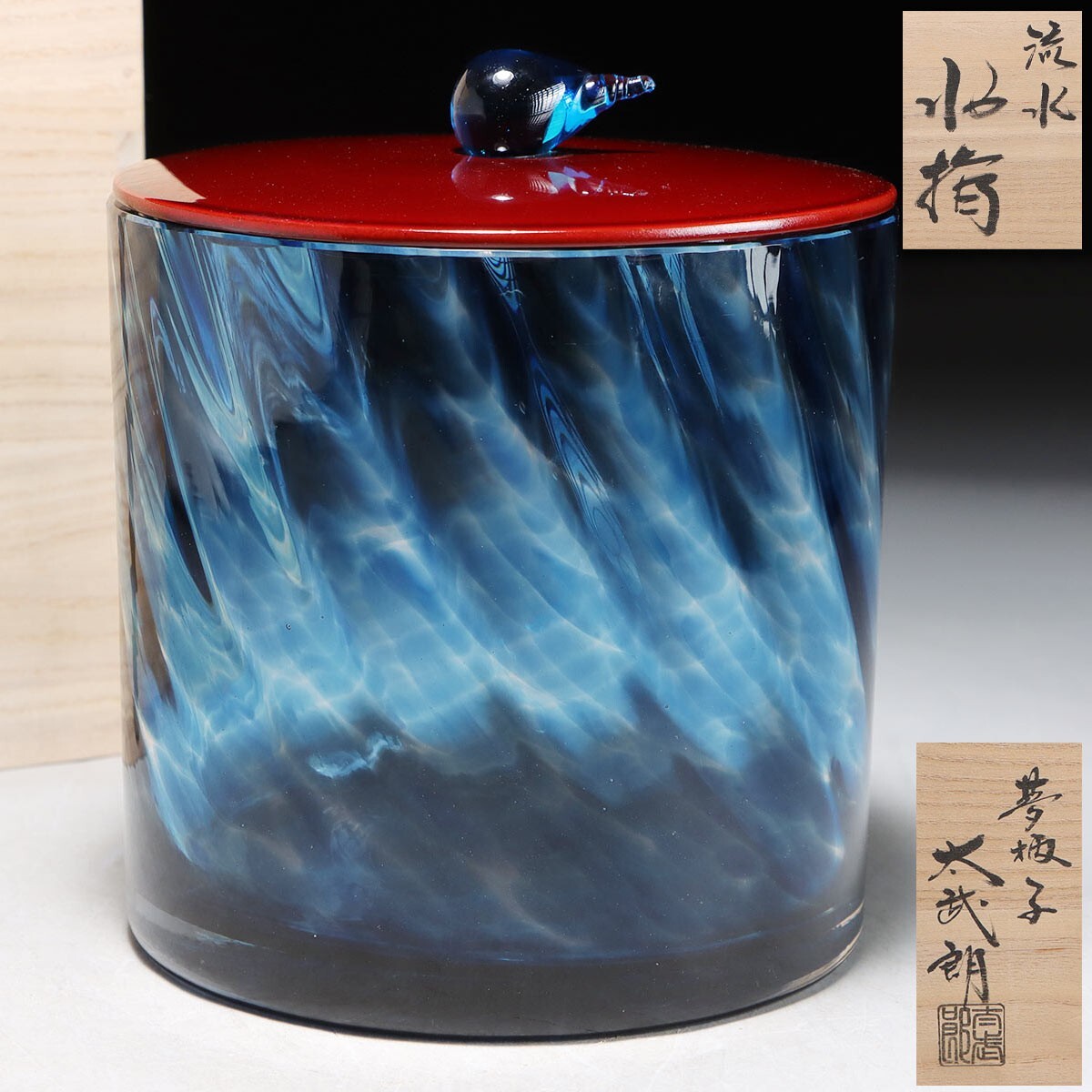 ご覧いただきありがとうございます。 茶道具【夢柄子 太武朗】 硝子 流水水指 共箱の出品です。