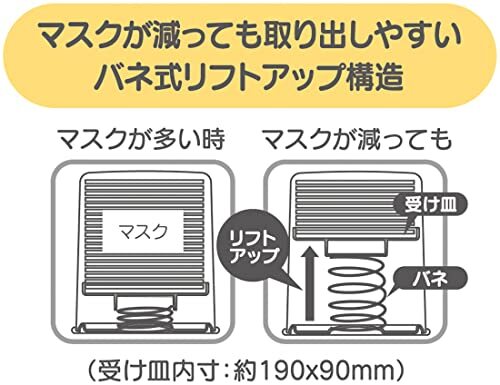 普通サイズのマスク(プリーツタイプ四角形)が約60枚収納できる マスクケース フタ部分の手前を押すだけでサッとフタが開くワンプッシュオープン式 マスクが減ってもバネによりマスクが上がってくるので取り出しやすい、リフトアップ構造 見た目ではマスクケースには見えないところがGOODポイント