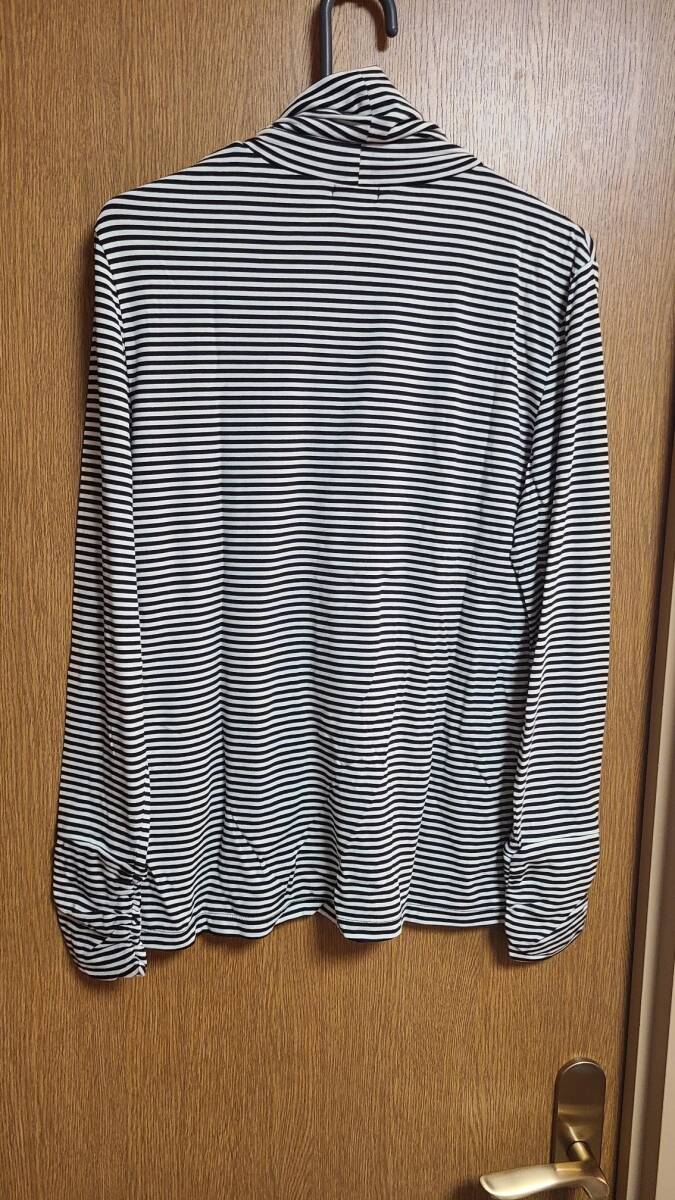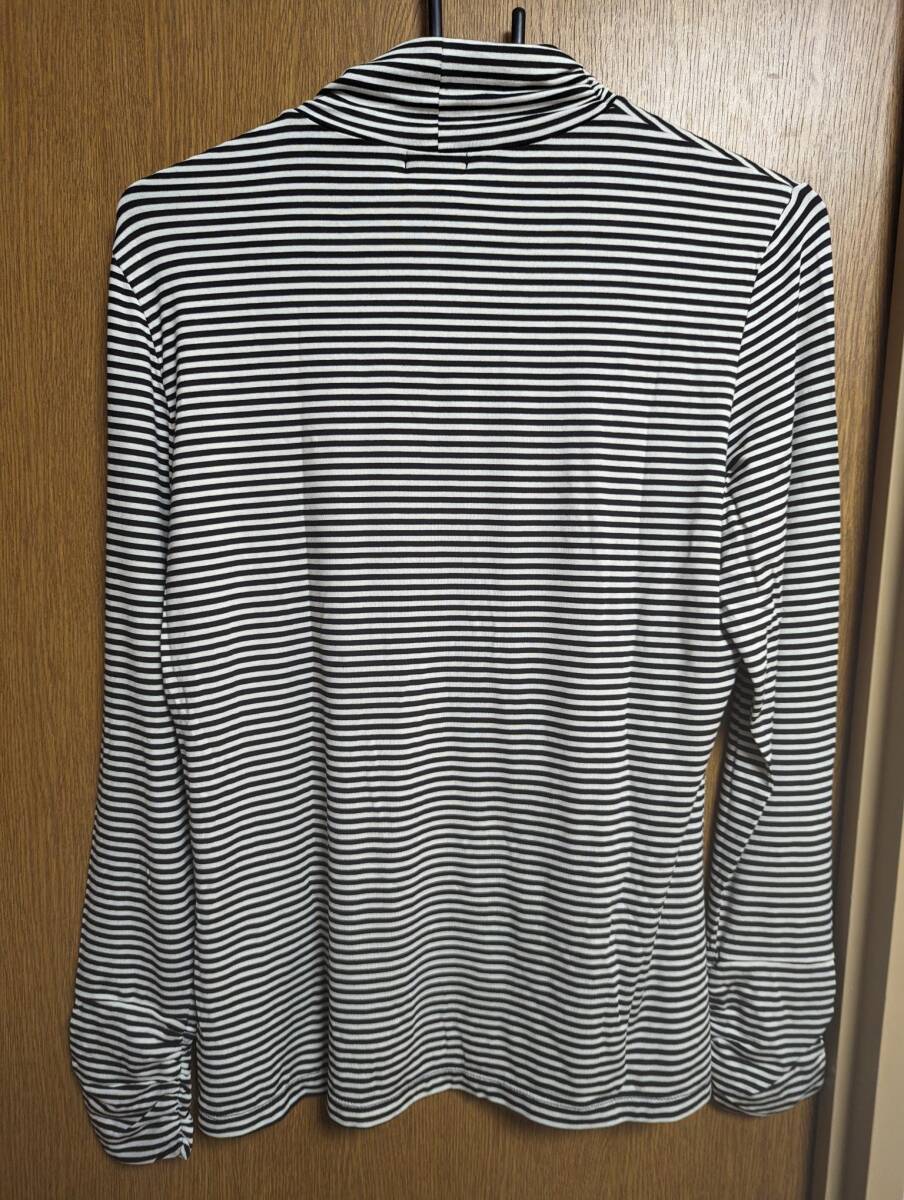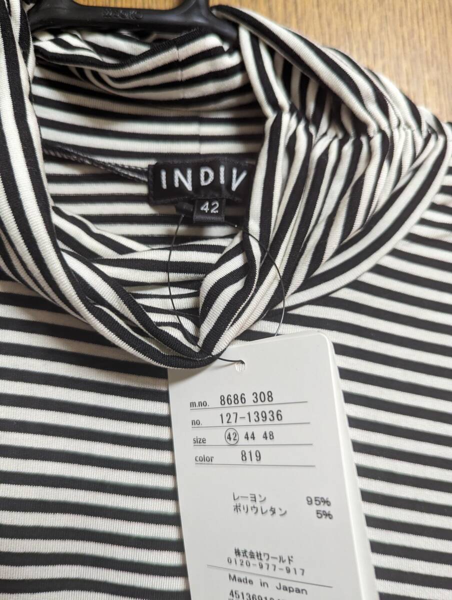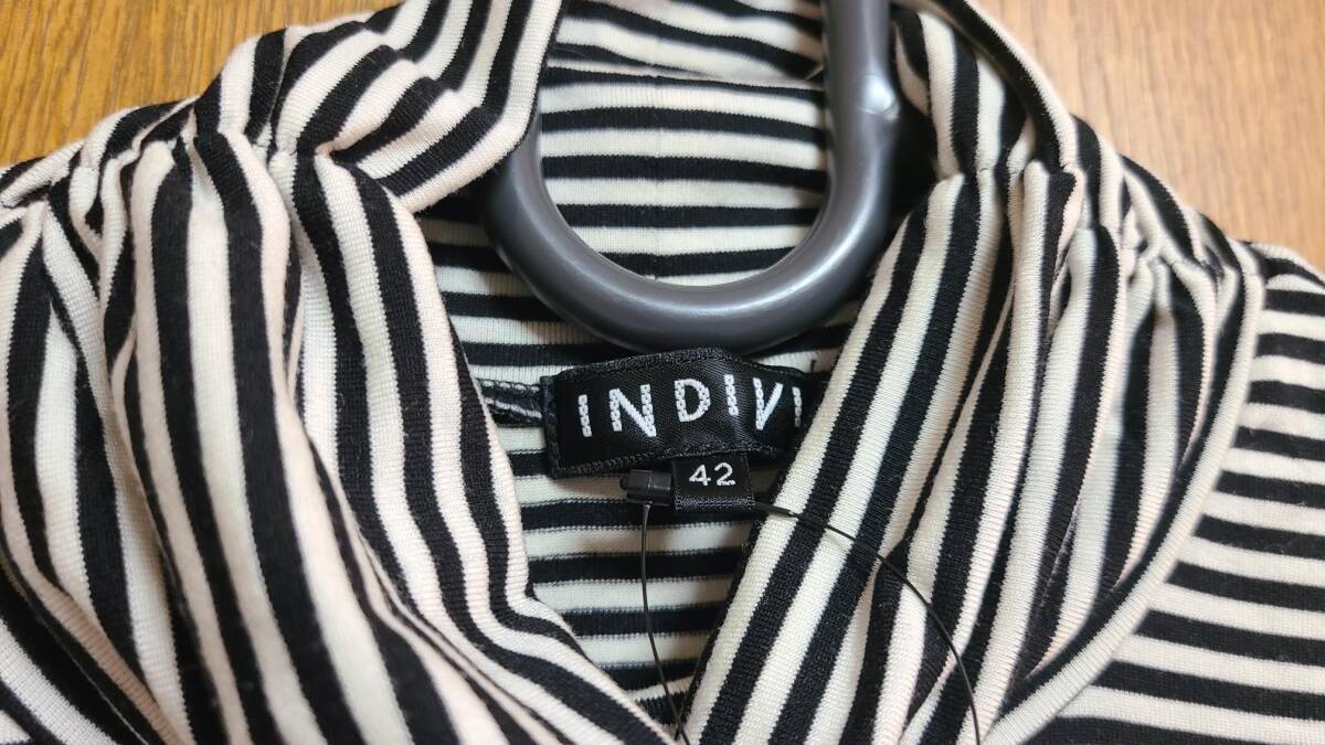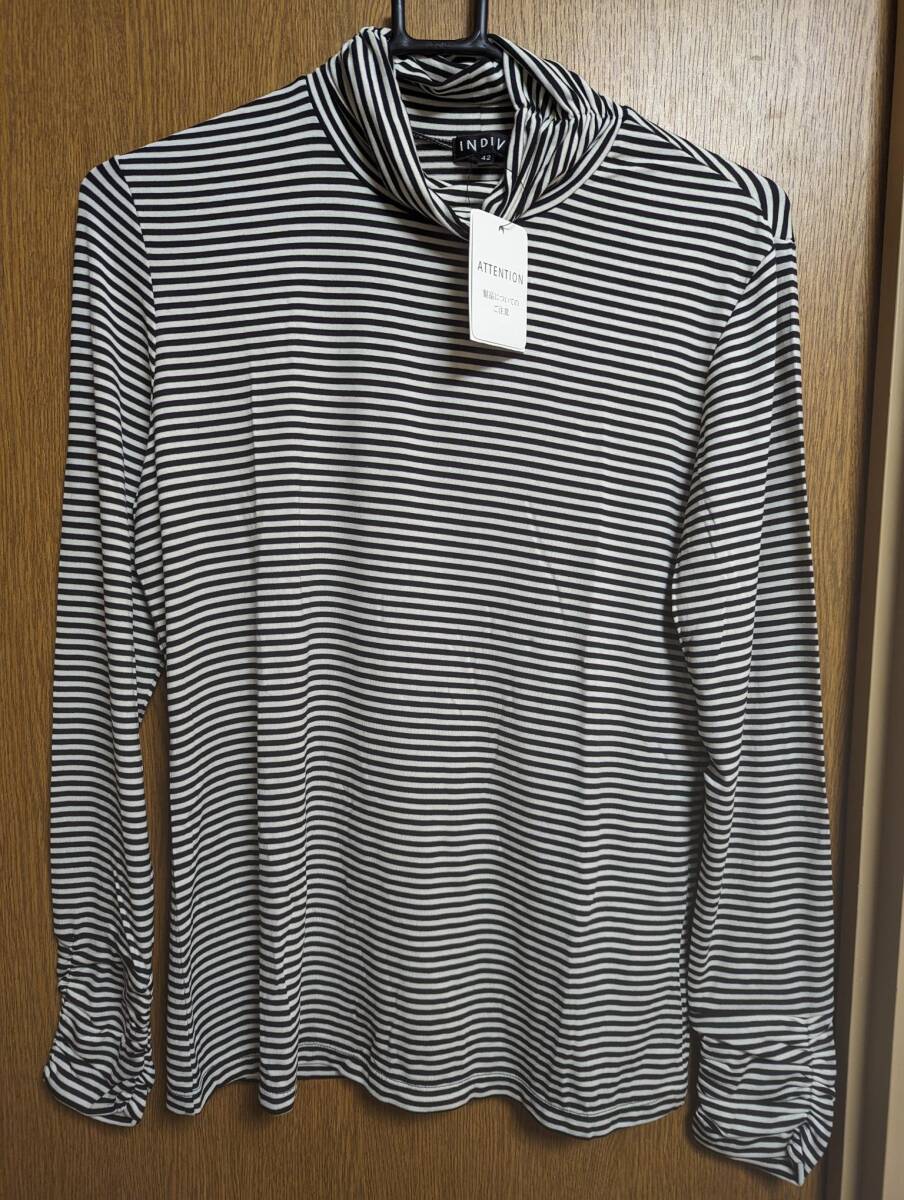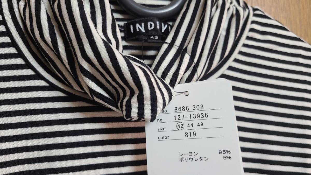 INDIVI昨季新品白×黒ボーダー柄ウルトラストレッチタートルネックカットソー大きいサイズ4211号12号ハイネックインナー長袖ロンT