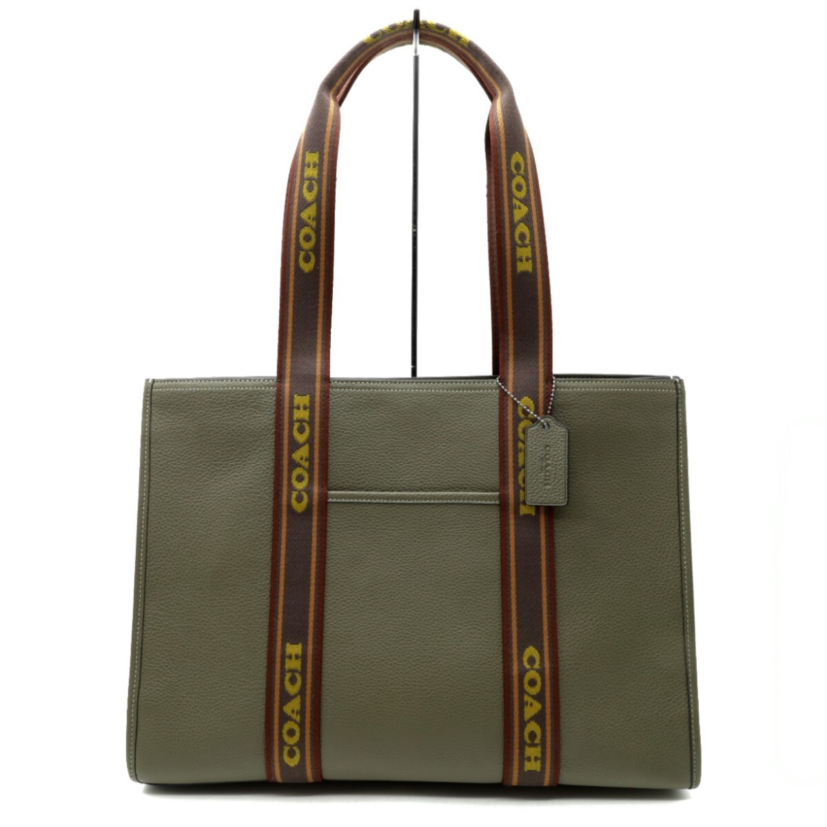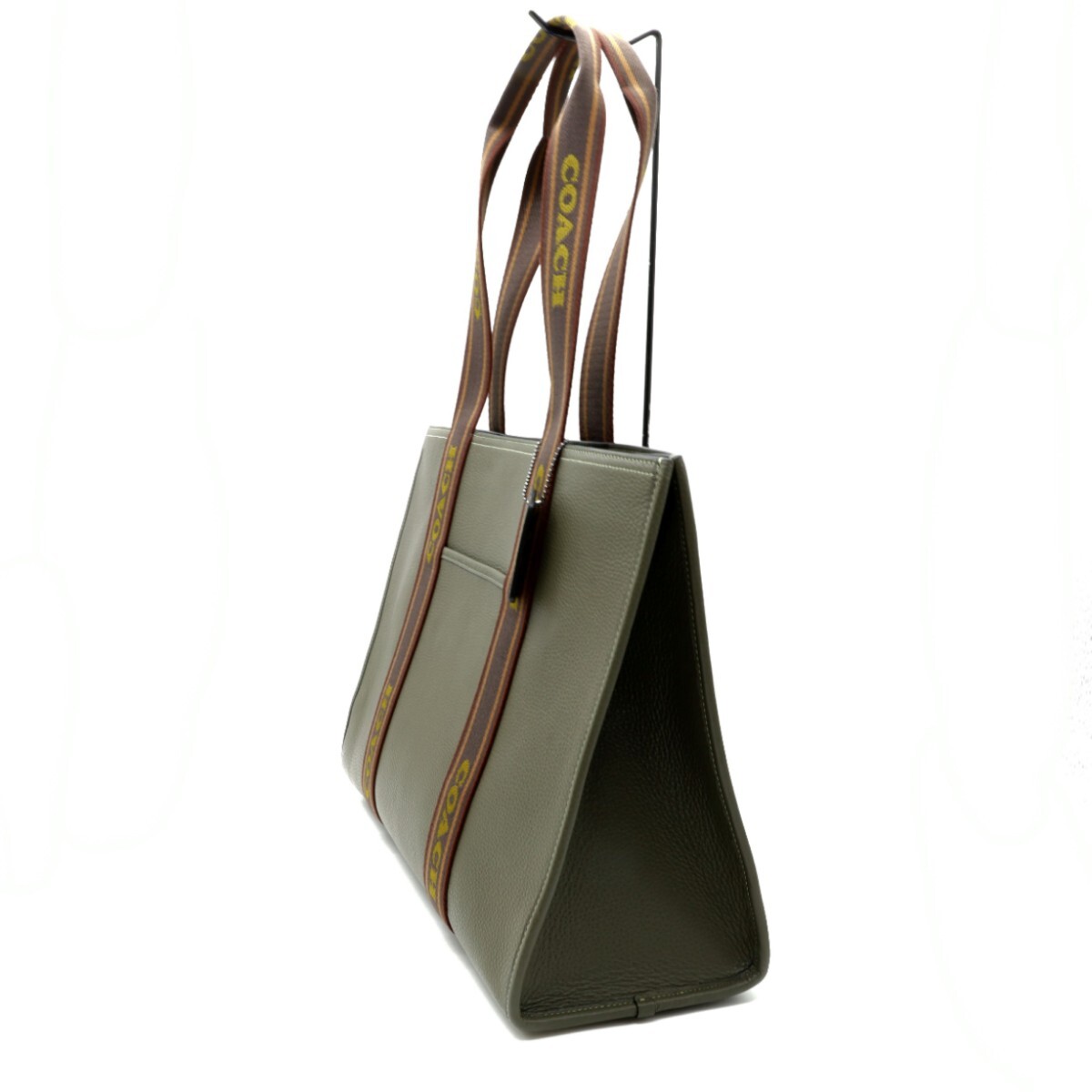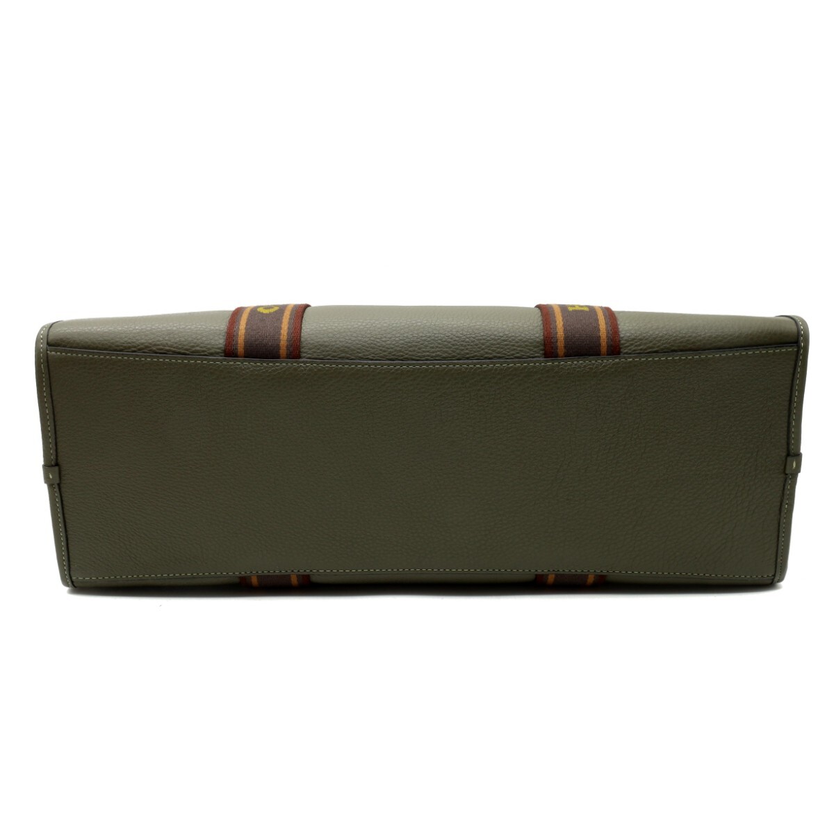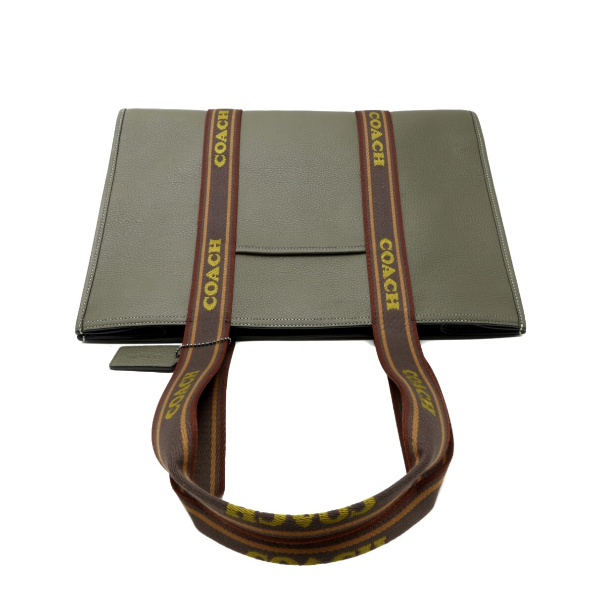 上質なペブルドレザーを使用した、スタイリッシュなトートバッグです。落ち着いたオリーブグリーンの本体に、ブラウンとイエローのロゴが織り込まれた幅広のストラップが、カジュアルでモダンなアクセントになっています。