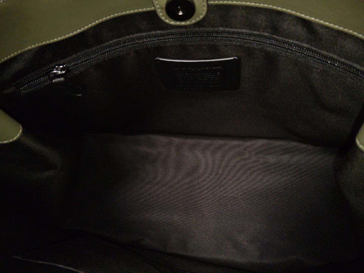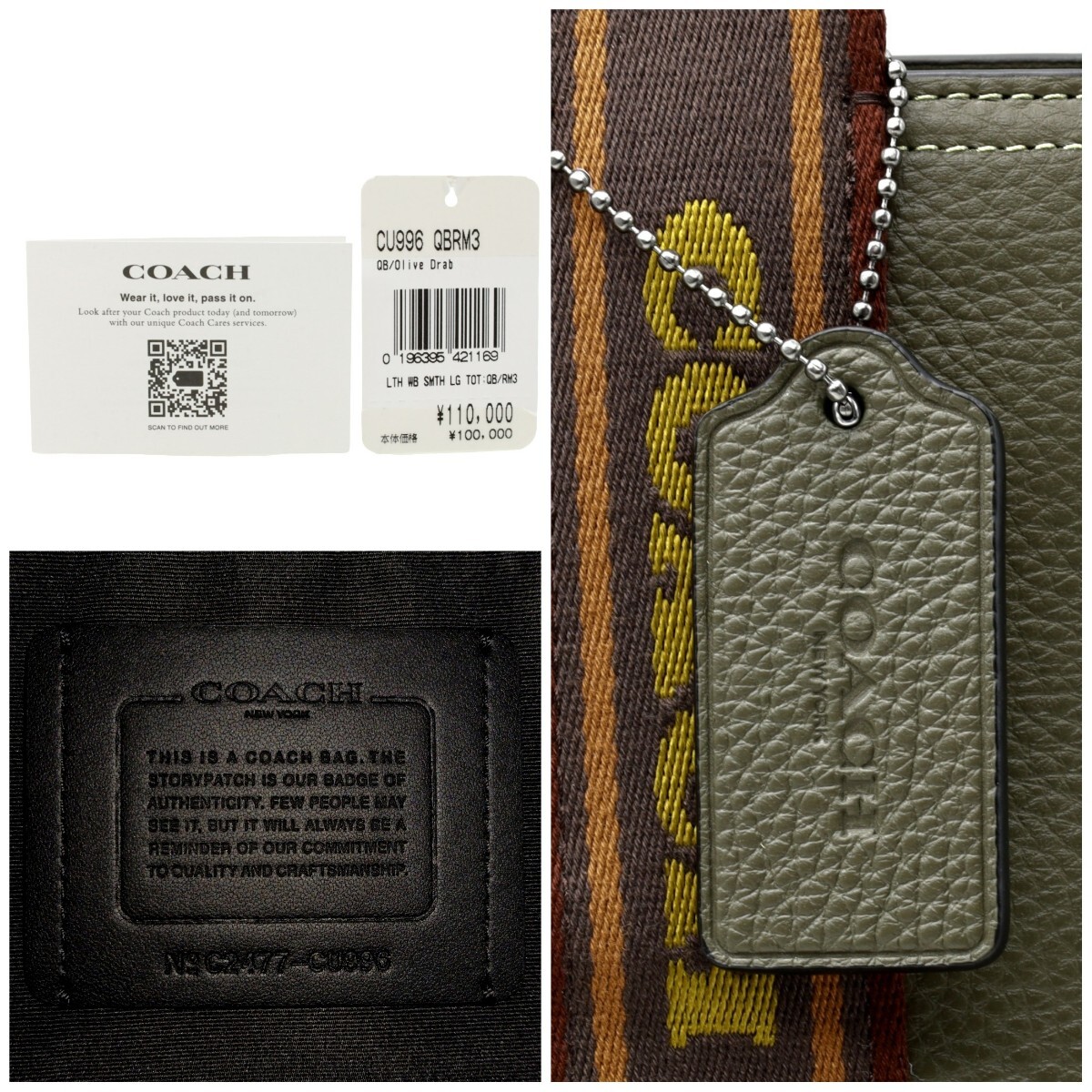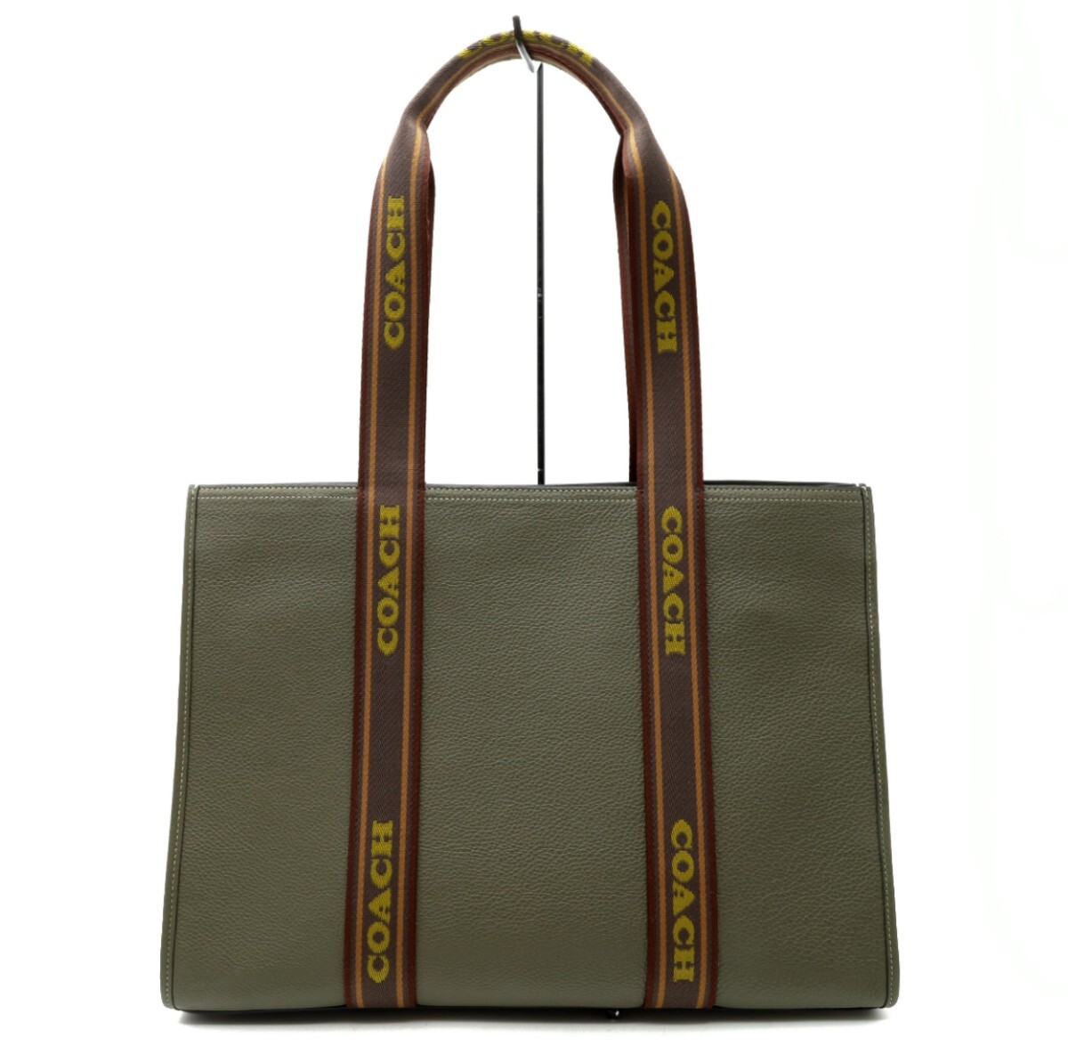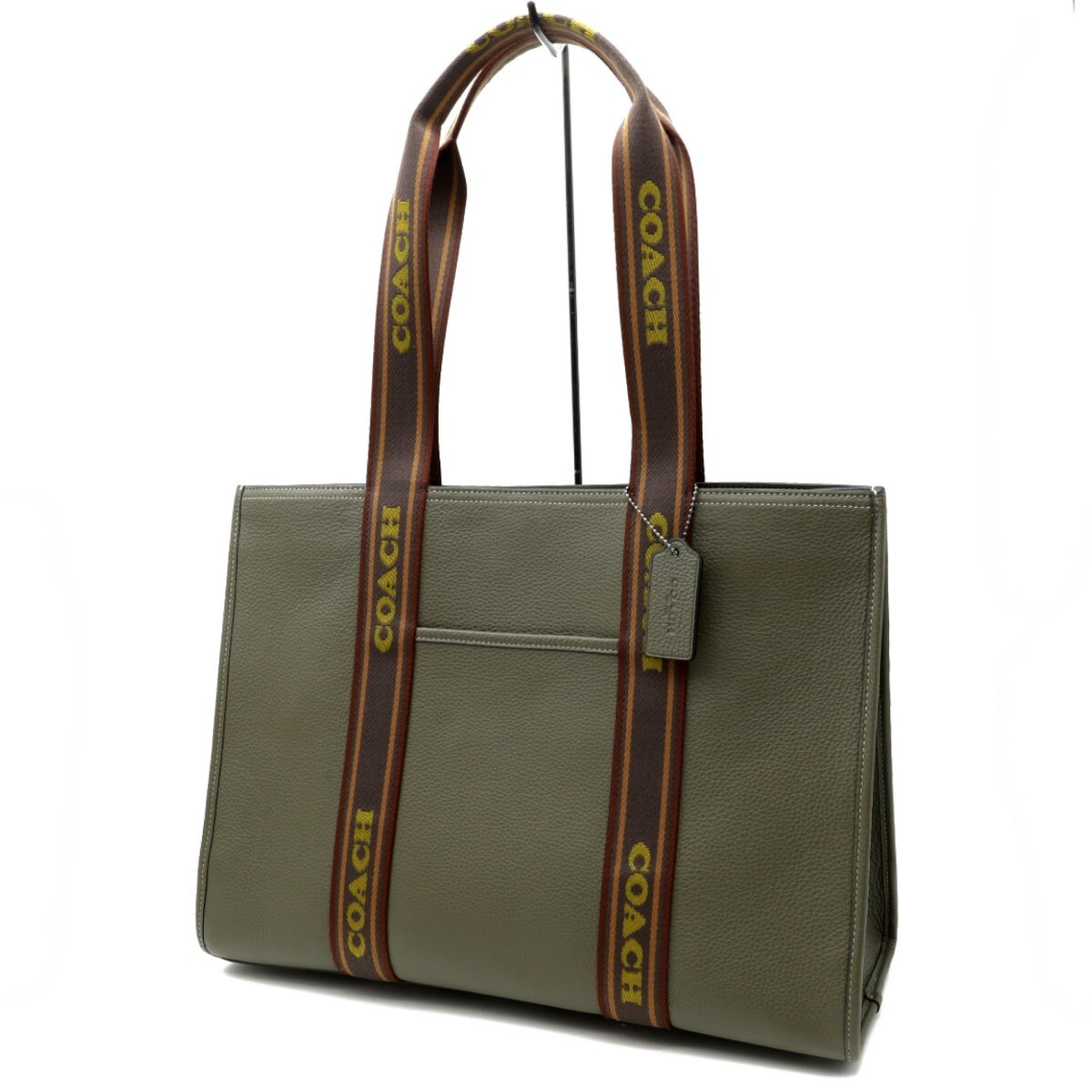上質なペブルドレザーを使用した、スタイリッシュなトートバッグです。落ち着いたオリーブグリーンの本体に、ブラウンとイエローのロゴが織り込まれた幅広のストラップが、カジュアルでモダンなアクセントになっています。