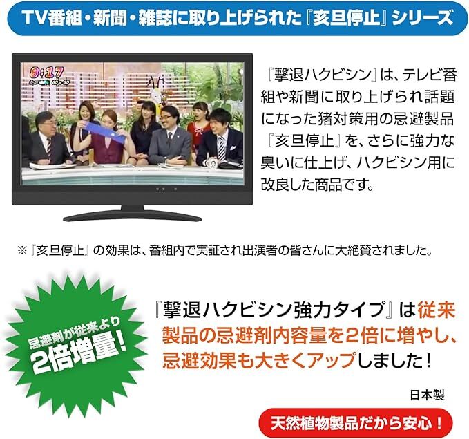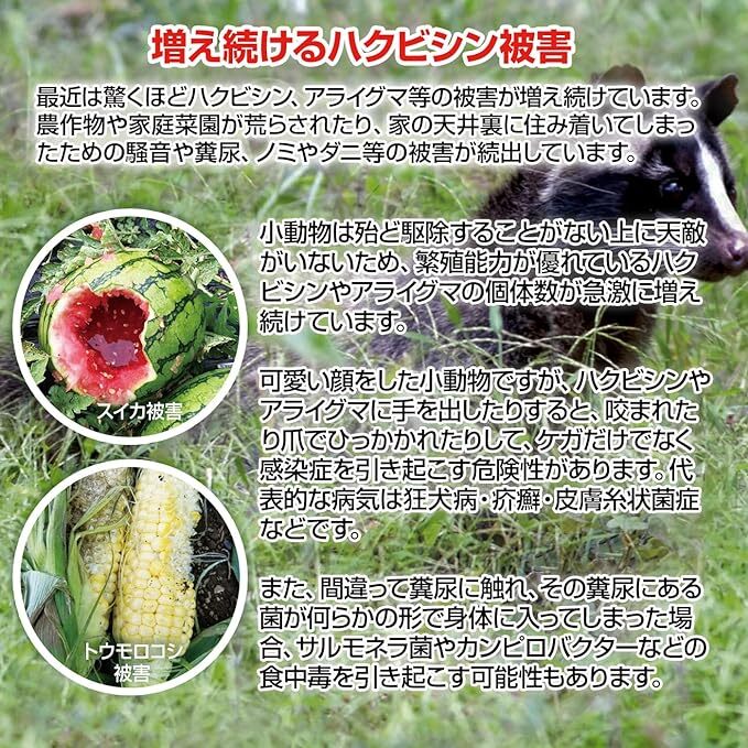 TV番組等で紹介されて話題になったイノシシ忌避剤『亥旦停止』(大型動物用)の忌避効果を約2倍に強化してハクビシン用に改良した従来の『撃退ハクビシン』が好評でしたが、新発売の【撃退ハクビシン強力タイプ】は、忌避剤の内容量を『撃退ハクビシン』よりさらに2倍に増量し、ニオイ効果が強力にアップしました!