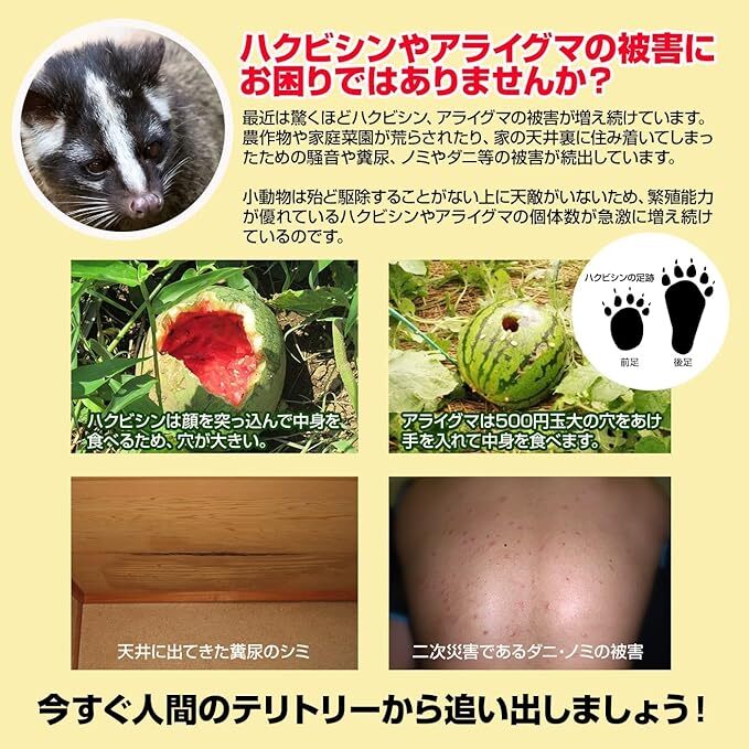 ●昨年、家庭菜園どころか自宅までハクビシンに侵入され、こちらの製品のお世話になりました。今年も購入です。