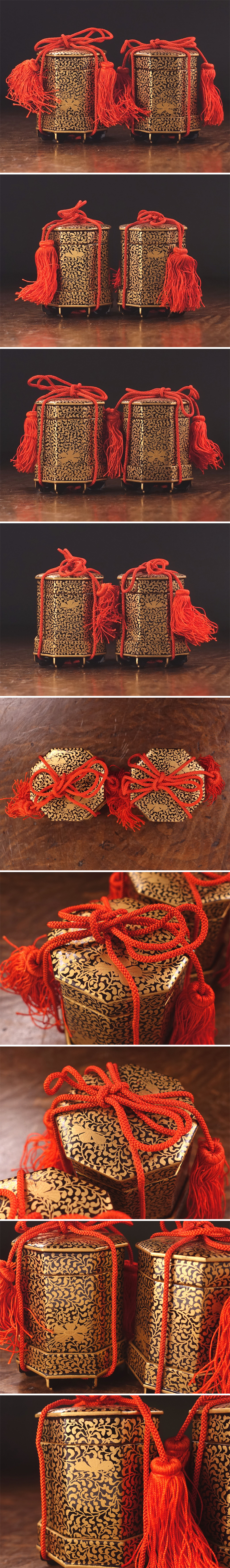 いわゆる七澤屋物に属する雛道具で、貝合わせの貝を収める貝桶をミニチュアにて表現しており、全体に大の字牡丹唐草文をあしらった高雅な意匠を特徴とし、漆黒と金蒔絵の美しいコントラストが雅やかな気品を醸し出しています。