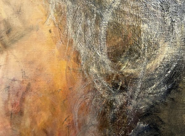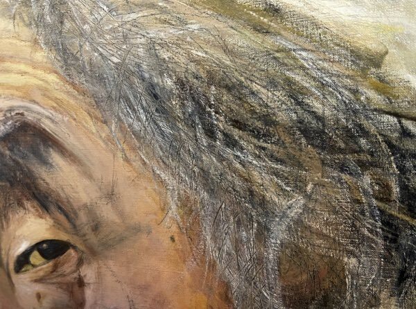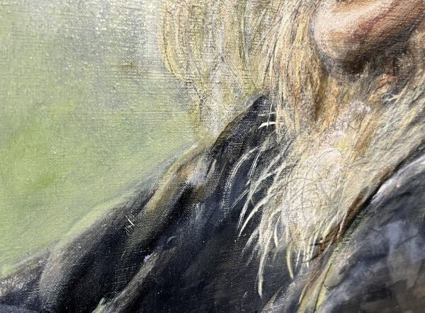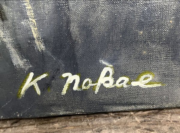 額装枠に若干の傷汚れあり、裏蓋に割れを直した跡があり、また留め具が数箇所取れていますが、キャンバスは綺麗な状態です。