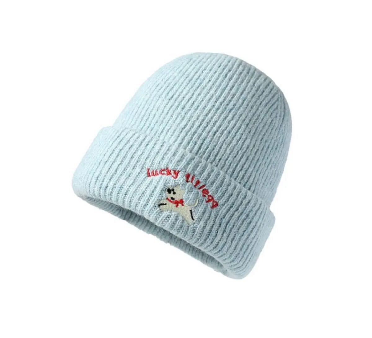 刺繍が特徴の水色ニット帽で、カジュアルなスタイルにぴったりです。