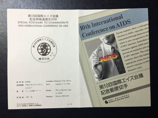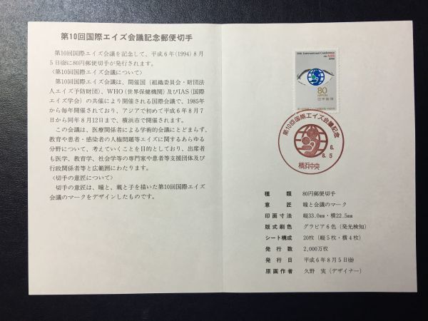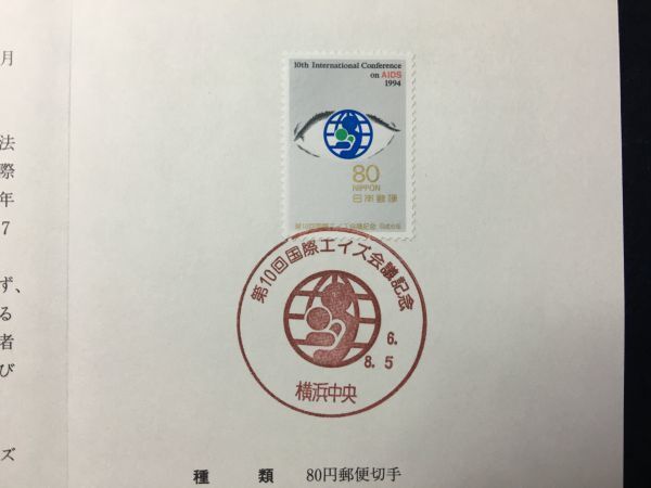 4078希少1994年 郵便文化振興協会 記念切手解説書 第10回国際エイズ会議 横浜中央6.8.5FDC初日記念カバー使用済消印初日印記念印特印風景印