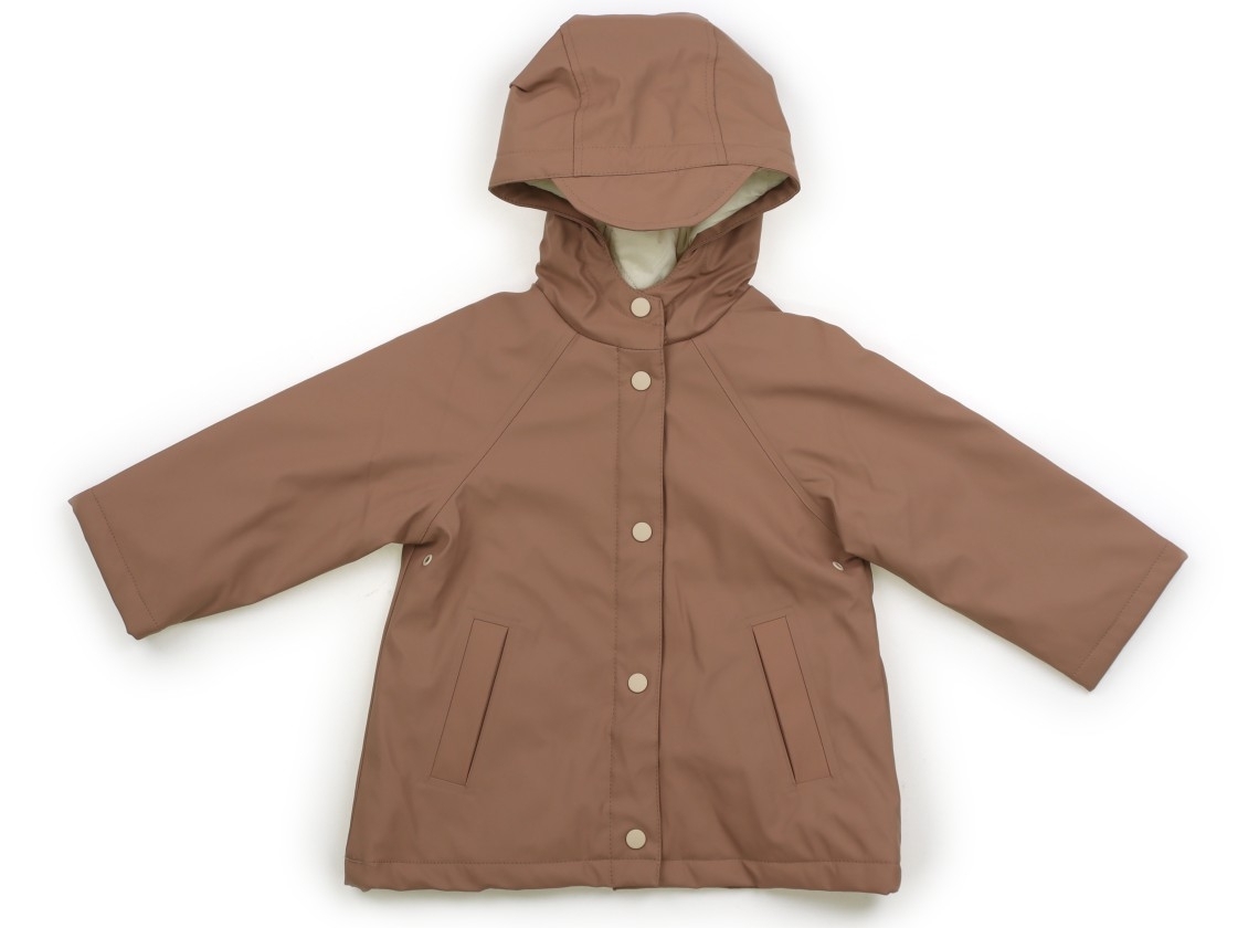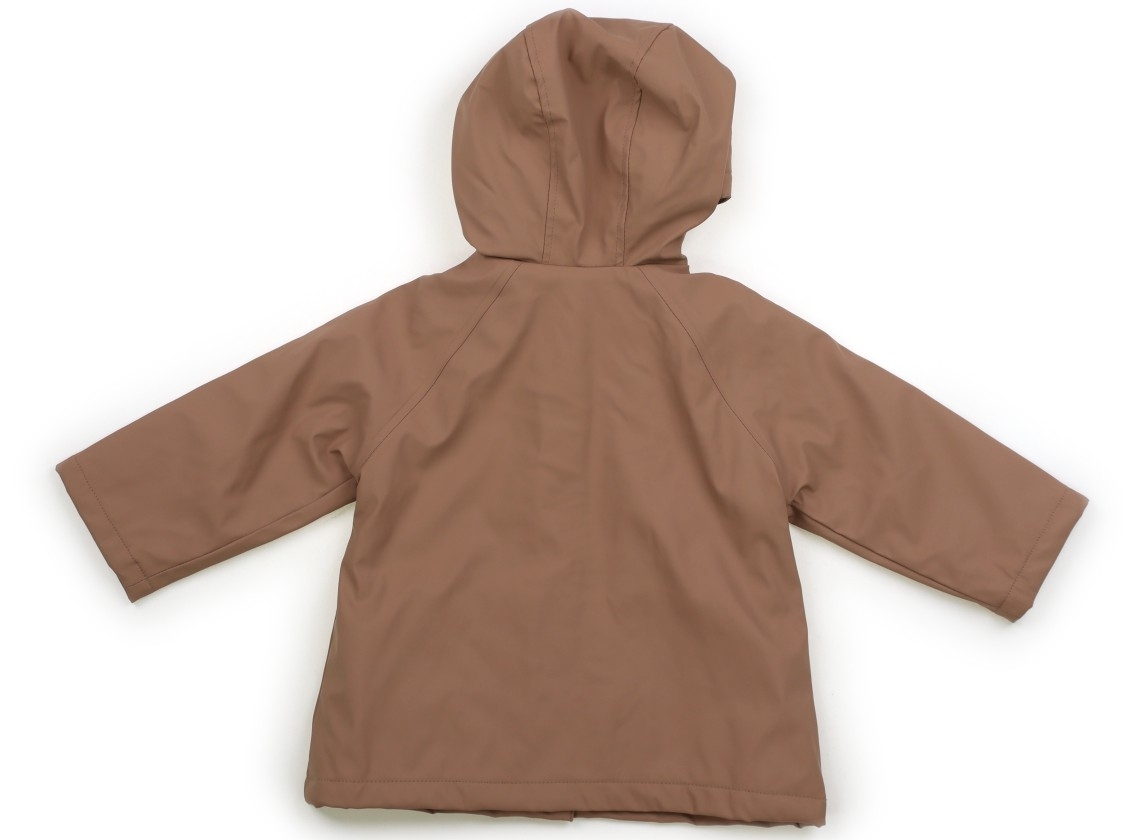 ポリウレタン加工ポリエステル素材。スナップボタン開き。中綿入り。フードは縫い付けです。実際のサイズ表記は、98cm。目立った汚れのない良品です。