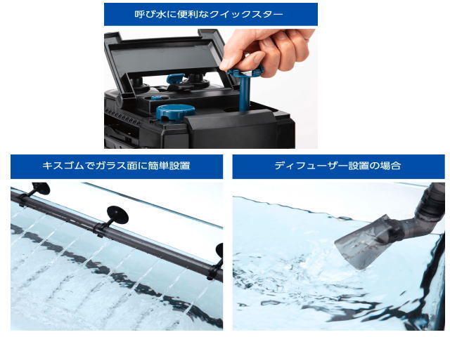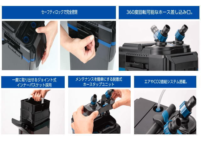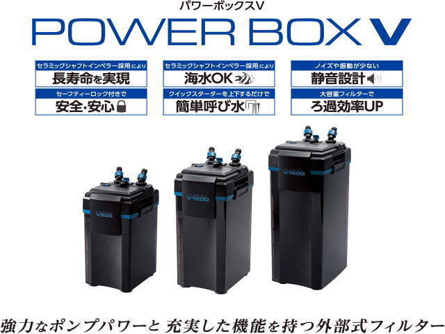 | 商品名:パワーボックス V900 強力なポンプパワーと充実した機能を持つ外部式フィルター ・本体をキャビネットに収納することで、水槽周りをスッキリ見せる事が可能 ・淡水・海水使用可能で、幅広い魚を飼育できる。 CO2が逃げにくいため、水草飼育にも最適 ・ろ過効率をあげるインナーバスケット採用 他のフィルターよりも多くのろ材を導入できる外部フィルターは、 ろ材やマットにバクテリアを繁殖させる生物ろ過能力に優れている。 ・動作音が少ない、静音設計 ・シンプルな構造、セラミックシャフト採用により耐用年数が高い ・エアやCO2直結システム搭載 水槽内に拡散器などの器材が入らないので水槽内がスッキリ ■商品仕様 適応水槽:60~90cm ポンプ流量:50Hz約870L/h、60Hz約1000L/h 水槽設置時流量:50Hz約420L/h、60Hz約510L/h サイズ:W180xD250xH395mm ■セットろ過 SVウールマット、SVスポンジマット、パワーバイオ(スタート用) |