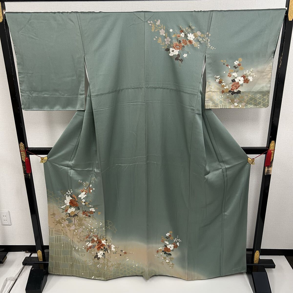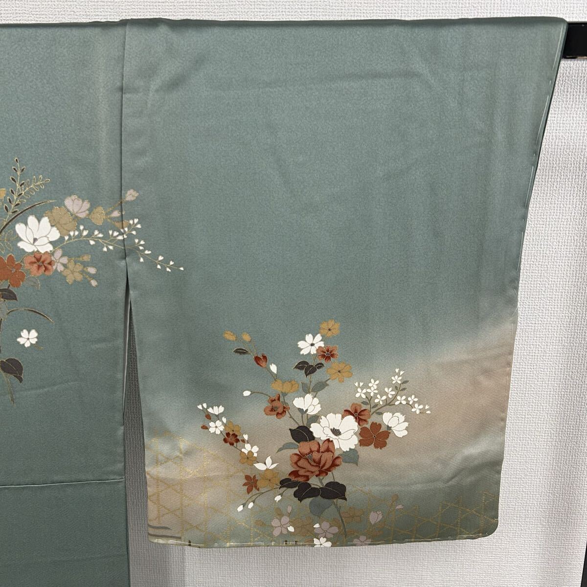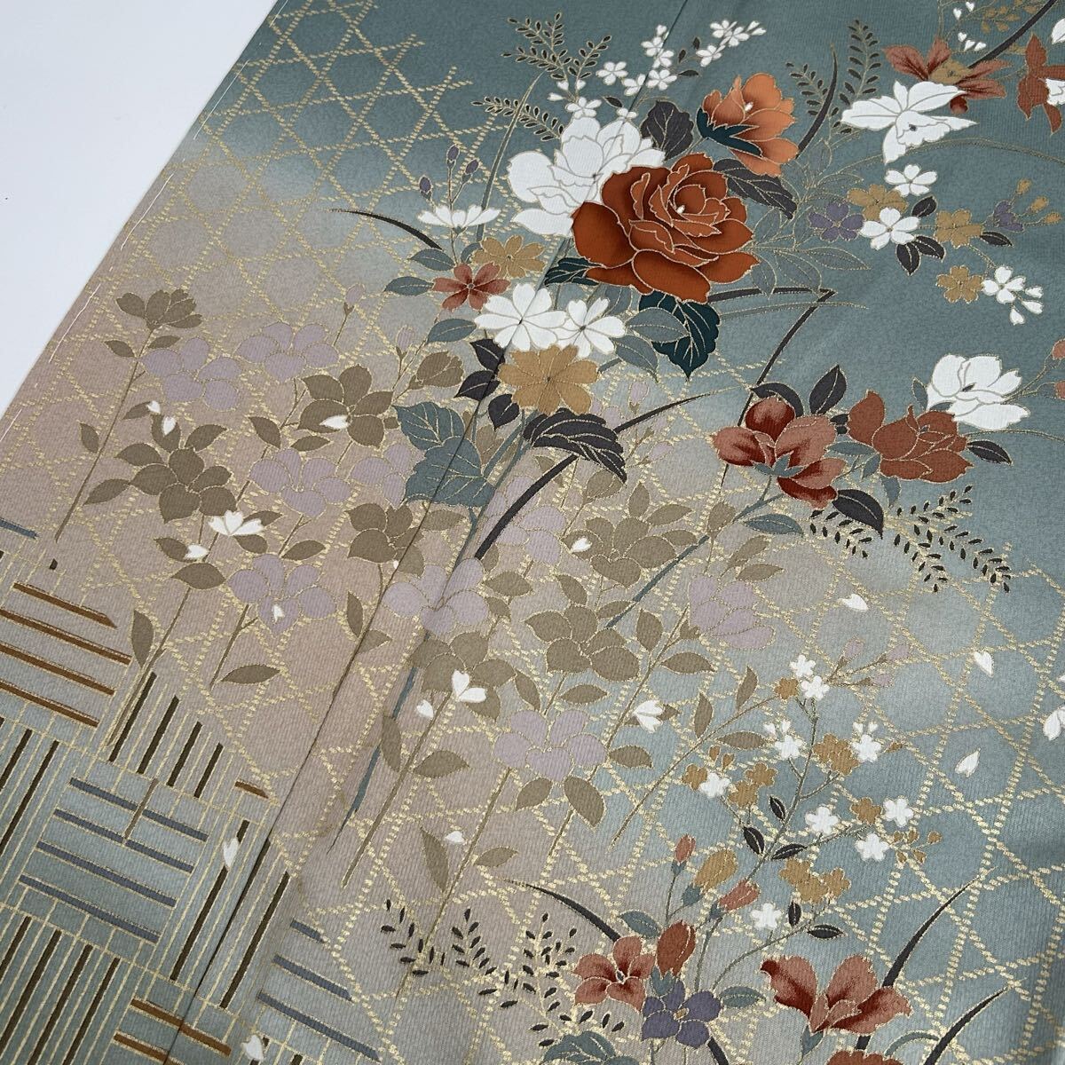 【楓】裄67 訪問着 正絹 紋なし 美しい花 袷 着物 KK-623