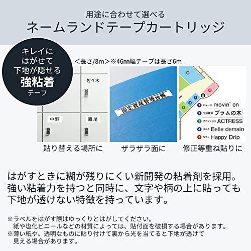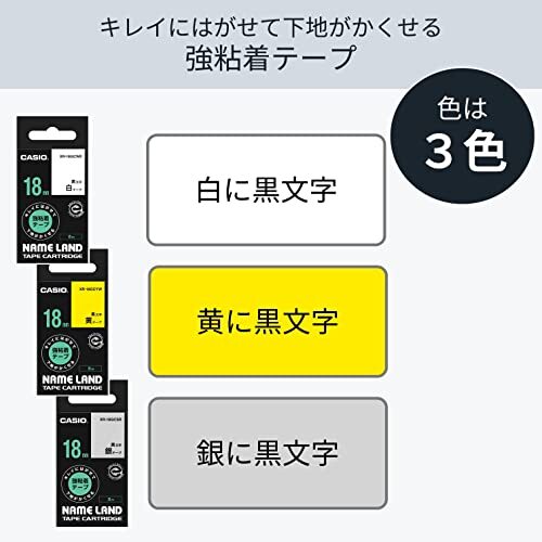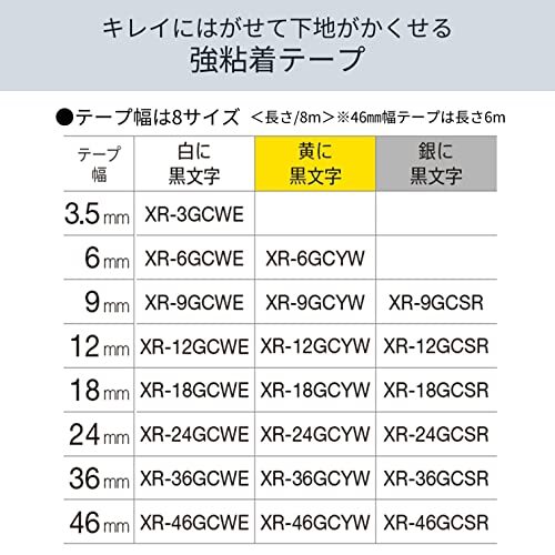 白に黒文字/18mm/XR-18GCWE・Size:18mmColor:白に黒文字・パッケージ個数:1・【テープ種類】キレイにはがせて下地がかくせる強粘着テープ・【テープ幅×長さ】18mm×8m・【タイプ】白に黒文字・【しっかり貼れる】粘着力は強粘着テープ同等。特殊な糊なので平面でもシボ面でも剥がせるのに、しっかり貼れる。・【はがしてもノリ残りがなくキレイ】剥がした後の糊残りがなく、剥がした後もきれい。