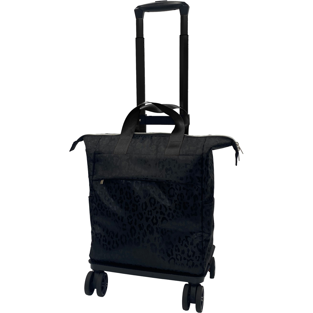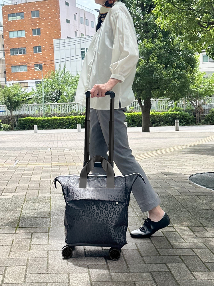 「cocoro レオパード4輪カート」は、光沢感のある生地を使ったレオパード柄の4輪カートです。ダブルホイール仕様のタイヤで安定した移動が可能です。