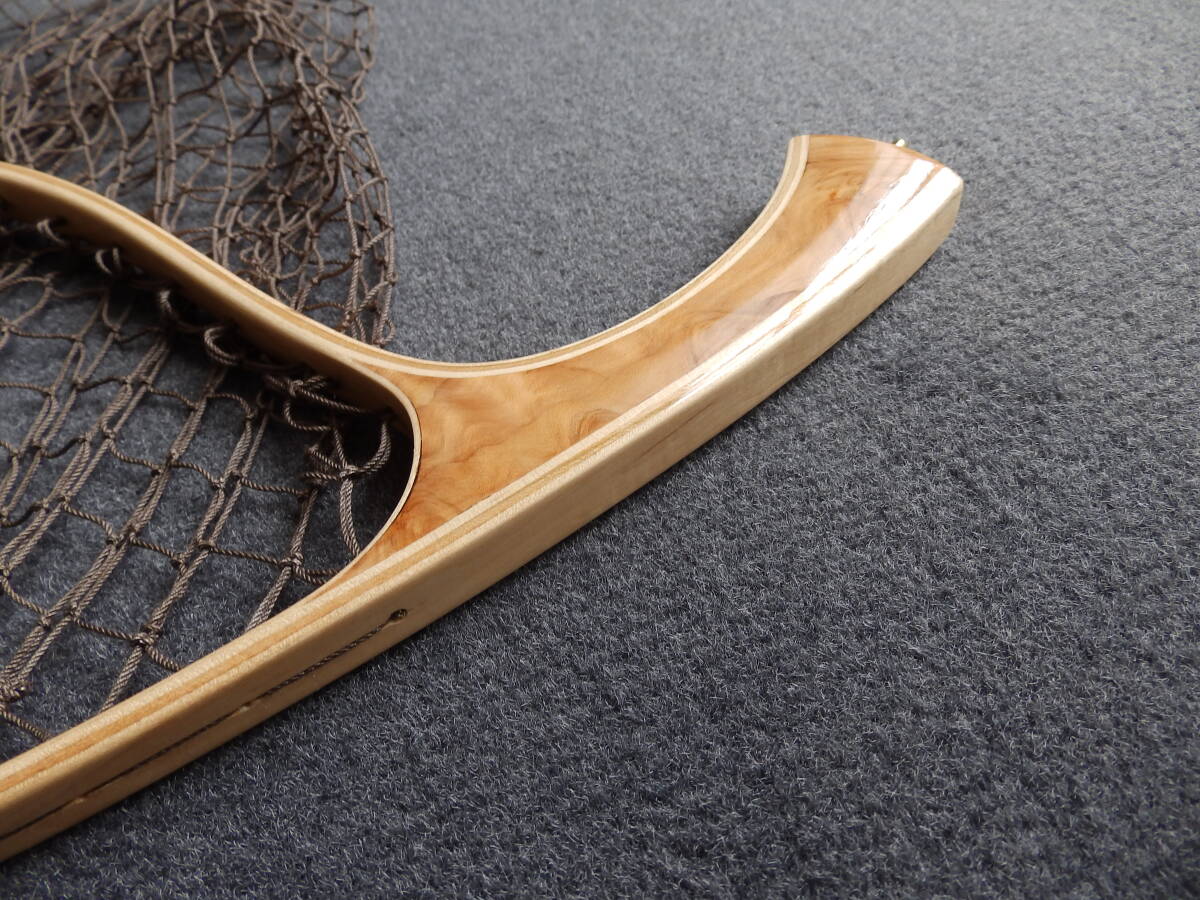 ご覧頂き有難う御座います。カーブ型のネットを出品します。サイズは全長37.3cm(金具は含みません)、全巾は19.7cm、内径は26.1cmX18.4cmという寸法です。網はクレモナ糸3号で濃いこげ茶色です。深さは取り付け部より約31.0cmです(サイズの多少の違いはご勘弁下さい)。使用しています材料はフレーム外側から2番がサクラで後がカエデの4枚合わせです。グリップはヤナセ杉の杢を使用しています。画像はカメラ、PC周辺機器により多少の違いが有ると思いますのでご了承下さい。素人の全て手作りの為、粗は多々有ると思いますので気にされる方は入札をお控え下さい。
