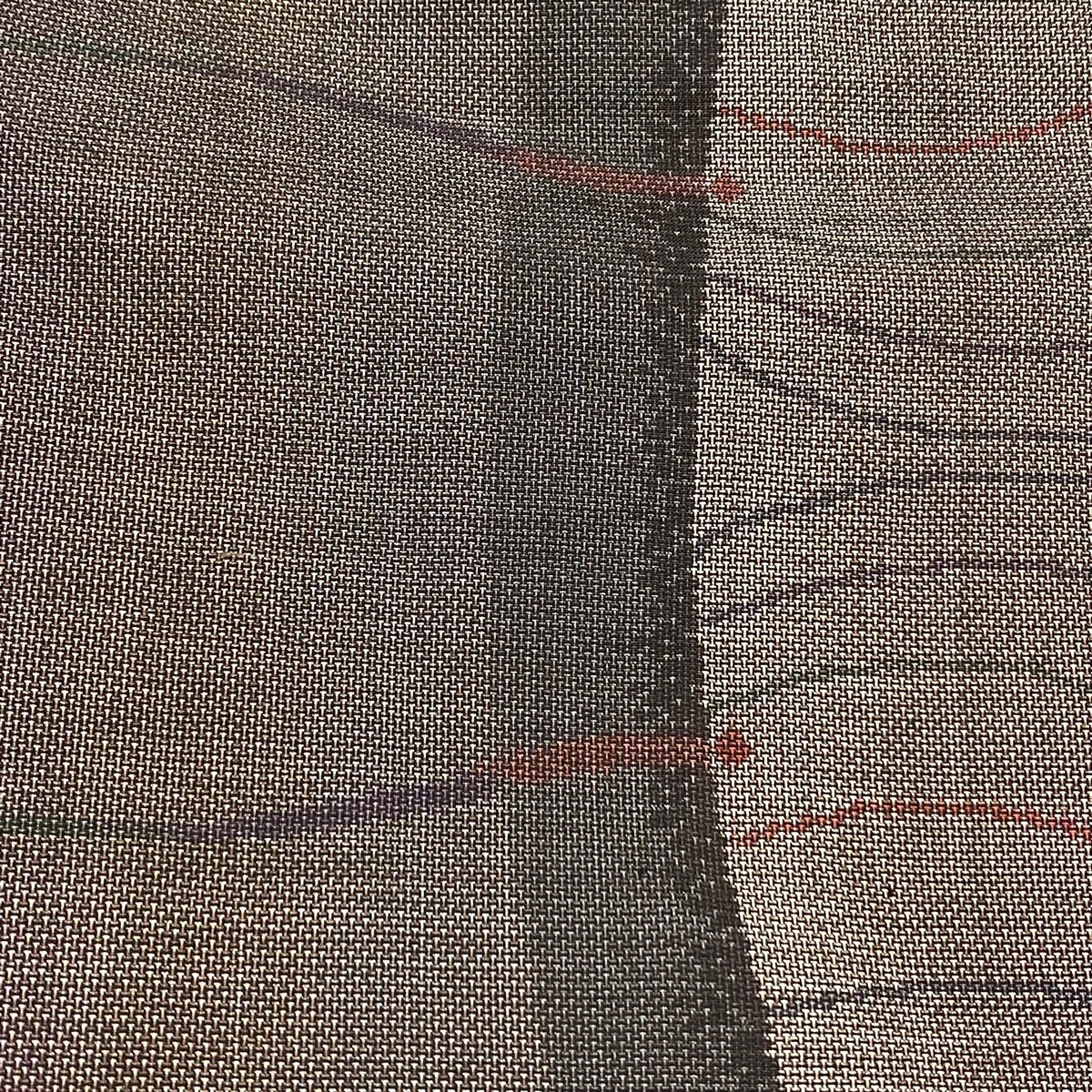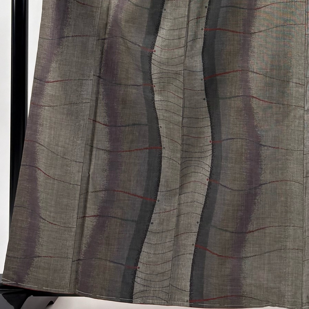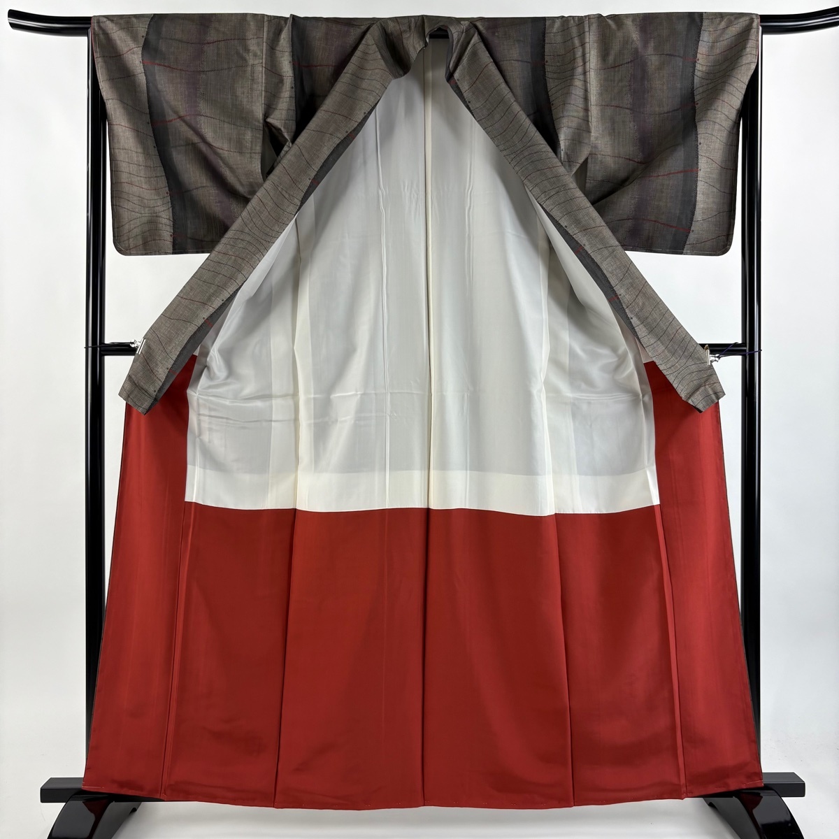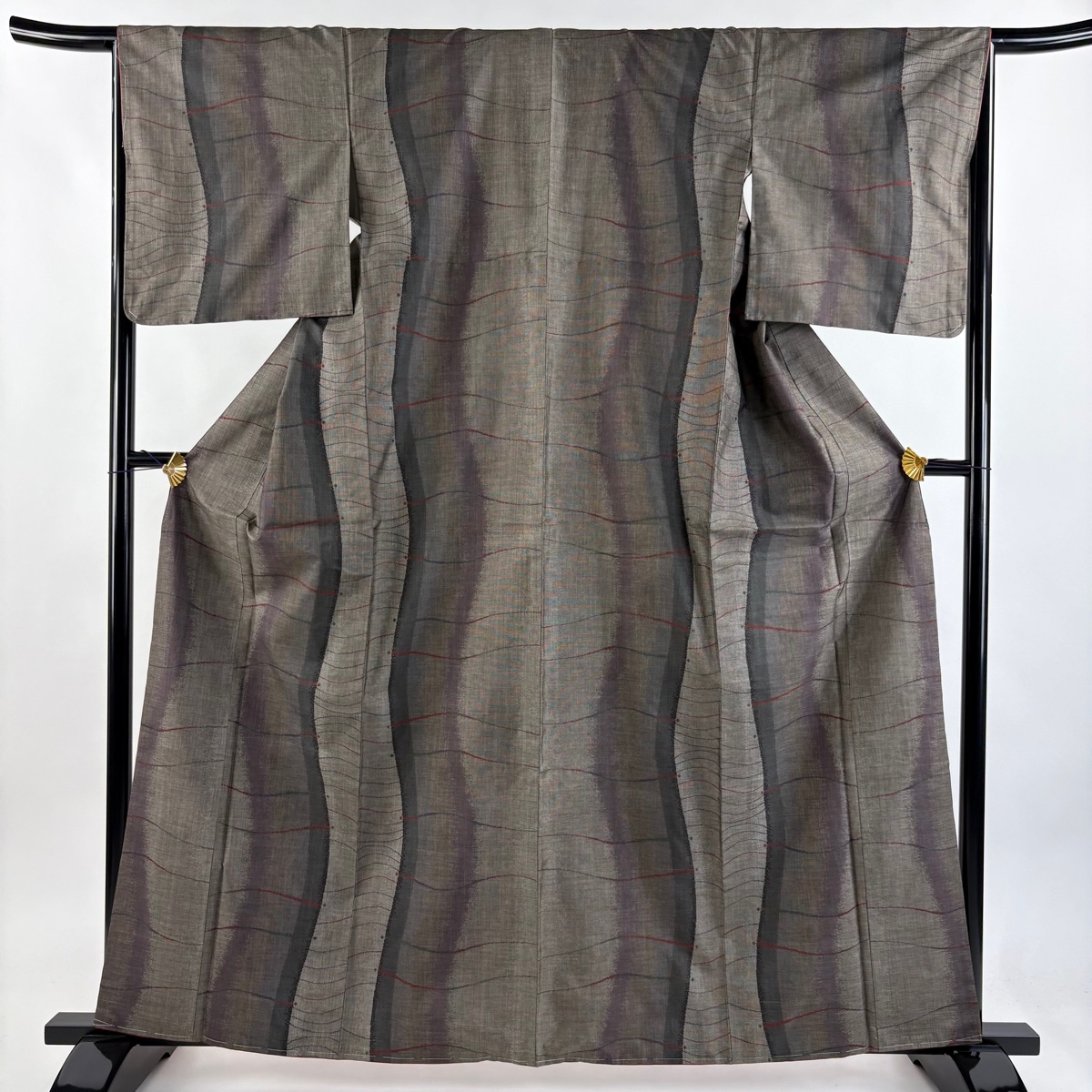 | 紬 美品 秀品 よろけ縞 幾何学模様 茶紫 袷 身丈162 裄丈65.5 M 正絹 【中古】 |