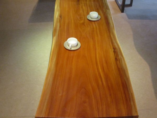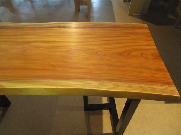 欅の一枚板無垢のテーブルです。目立つ節もなく、目を見張るほどのきれいさです。しっかり乾燥して、深紅のしっかり落ち着いた色味をしています。杢目も木肌も生き生きしています。元口~末口までがほぼ同じサイズですので使い勝手があります。裏面もきれいな木肌と杢目をしています。これから最終仕上げに入ります。よりきれいになります。