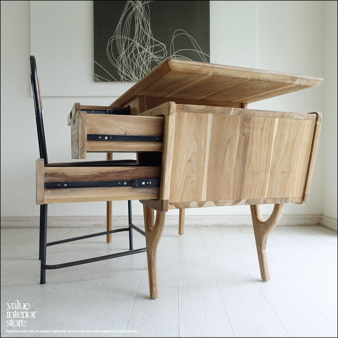 ■商品名 チークデスクVoide *こちらの商品は他サイトでも同時販売を行っておりますため、ご注文が重なりました場合、販売をさせていただけないこともございますので、その際はご容赦いただきますよう何卒お願い申し上げます。 ■商品説明 張りと硬さに定評のある樹種(チーク材)ですが、全体的に丸みを持たせることで、ナチュラルで無垢材独特の柔らかな質感を全面から感じていただけます。同じ素材でありながら色味の濃淡や木目などの異なる特徴は、無垢材の個性を感じさせてくれます。 ◇チーク材は世界三大銘木の一つとして知られ、硬さと張りがあり良質の天然油分を含むことから耐久性に優れています。特に細かな美しい木目が特徴で家具や建材など世界中で人気の高い木材です。 ◇日本製のような正確さは無いかもしれませんが、1点1点出来上がるまでの殆どの製作工程を手作業で行う、インドネシア家具職人たちの手づくり製法はとても暖か味が感じられます。細かな傷、ひび割れやフシ穴、お色の濃淡、また反りなどの無垢材特有の”暴れ”や修理痕が見受けられる場合がございますが、無垢材の素材や特徴、また手づくりのテイストとして工業品にはない自然の質感をお楽しみ下さい。 ◇チーク無垢材は人のお肌同様に、長時間、直射日光や冷暖房の風のあたる場所や湿気、乾燥が著しい場所を嫌います。反りや割れ、退色の原因になりますのでお避けください。 ■仕様 ・サイズ : (全体)横120cm × 奥行55cm × 高さ76cm(約) (引出内寸) *中央引出:横34cm×奥行30cm×高さ2cm *袖引出:(上)横21cm×奥行37cm×高さ8.5cm(下)横15cm×奥行37cm×高さ8.5cm (サイズは、計る場所によって誤差がございます。予めご了承下さい) ・素材 : チーク無垢材 ・生産国 : インドネシア ■備考 ◇この商品はその他商品と混載できません。 ◇掲載画像は十分配慮しておりますが、撮影時の光の反射や光量により明るさや色彩に違いがでますことや、素材の性質上、仕入れ時の材料によっても色味に多少濃淡がございます。また、ブラウザ上ではお色を正確に再現ができませんことを予めご了承下さい。 ◇商品はチークデスク×1点です。その他はイメージです。 ◇この商品はギフト包装をお受けできません。 |