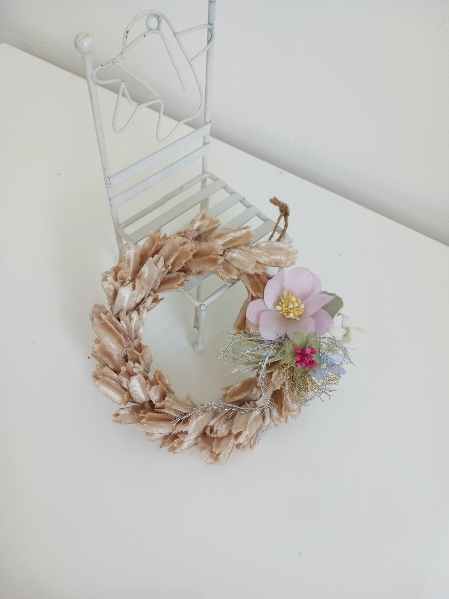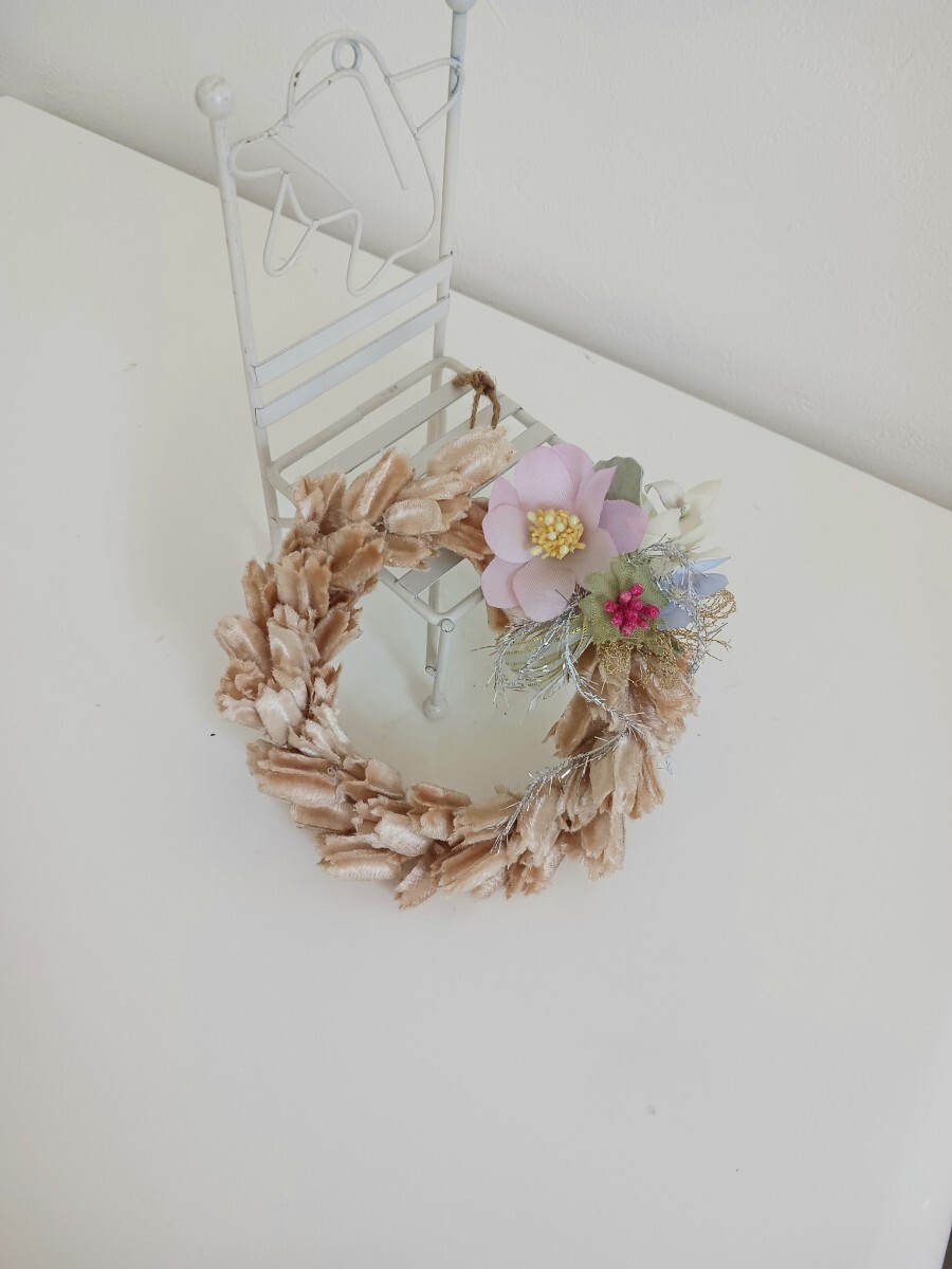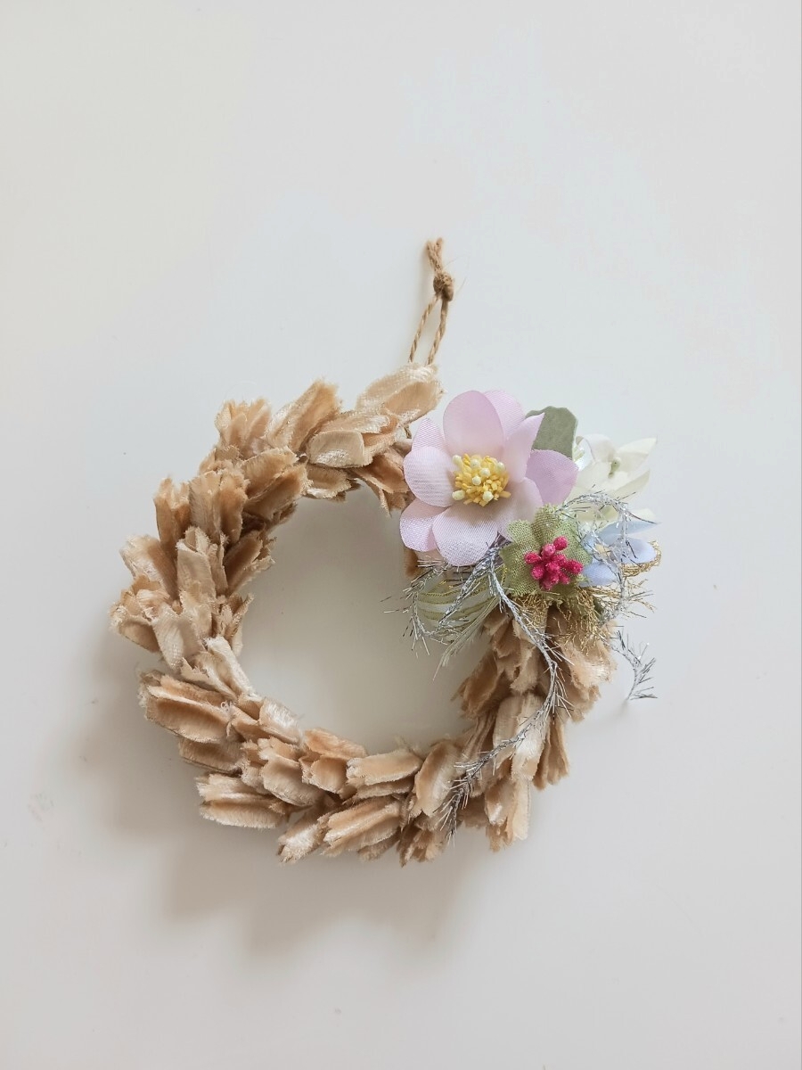 時と共に色彩が変化した、光沢のある布を染めた経年の布花、シランの花びらをリースにしました。
