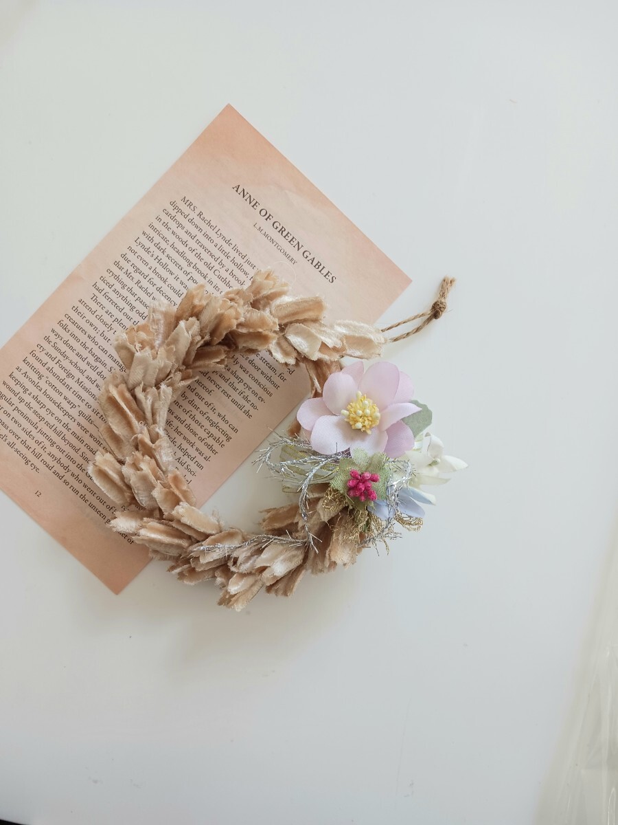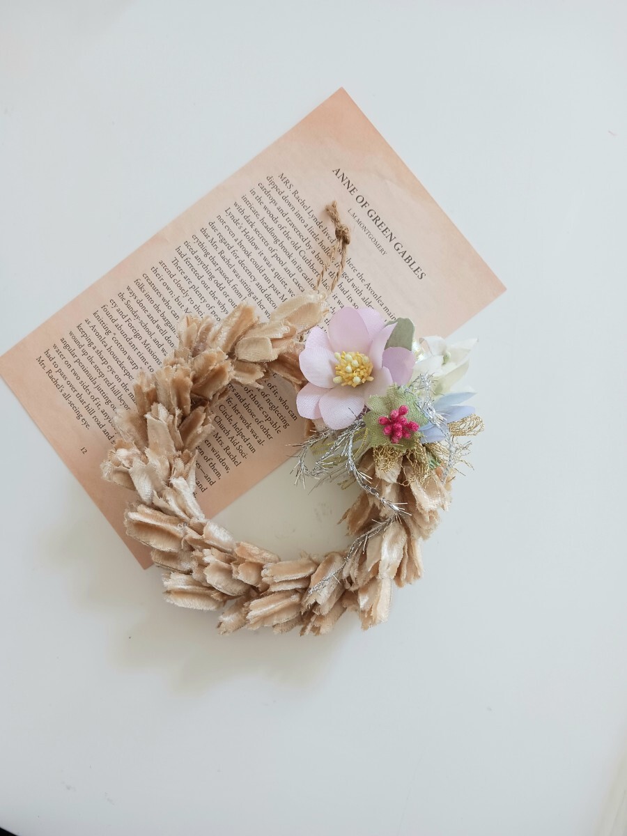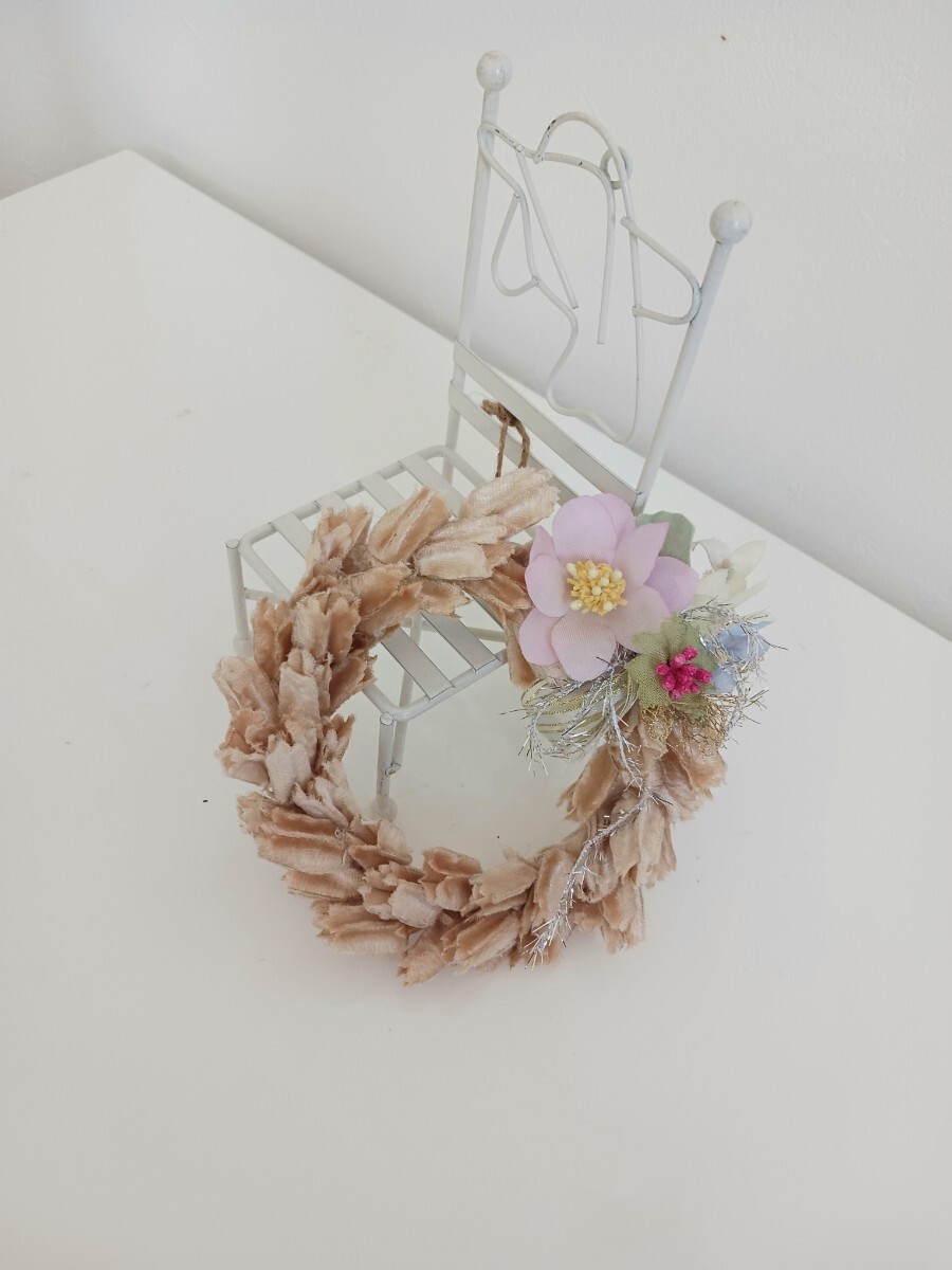 時と共に色彩が変化した、光沢のある布を染めた経年の布花、シランの花びらをリースにしました。