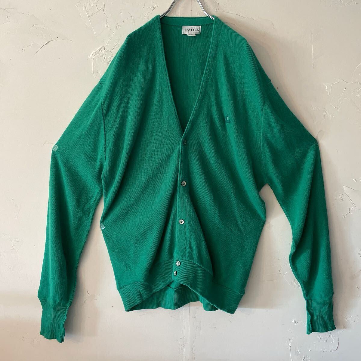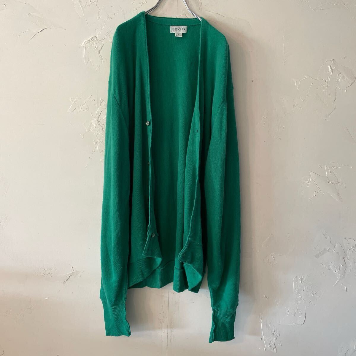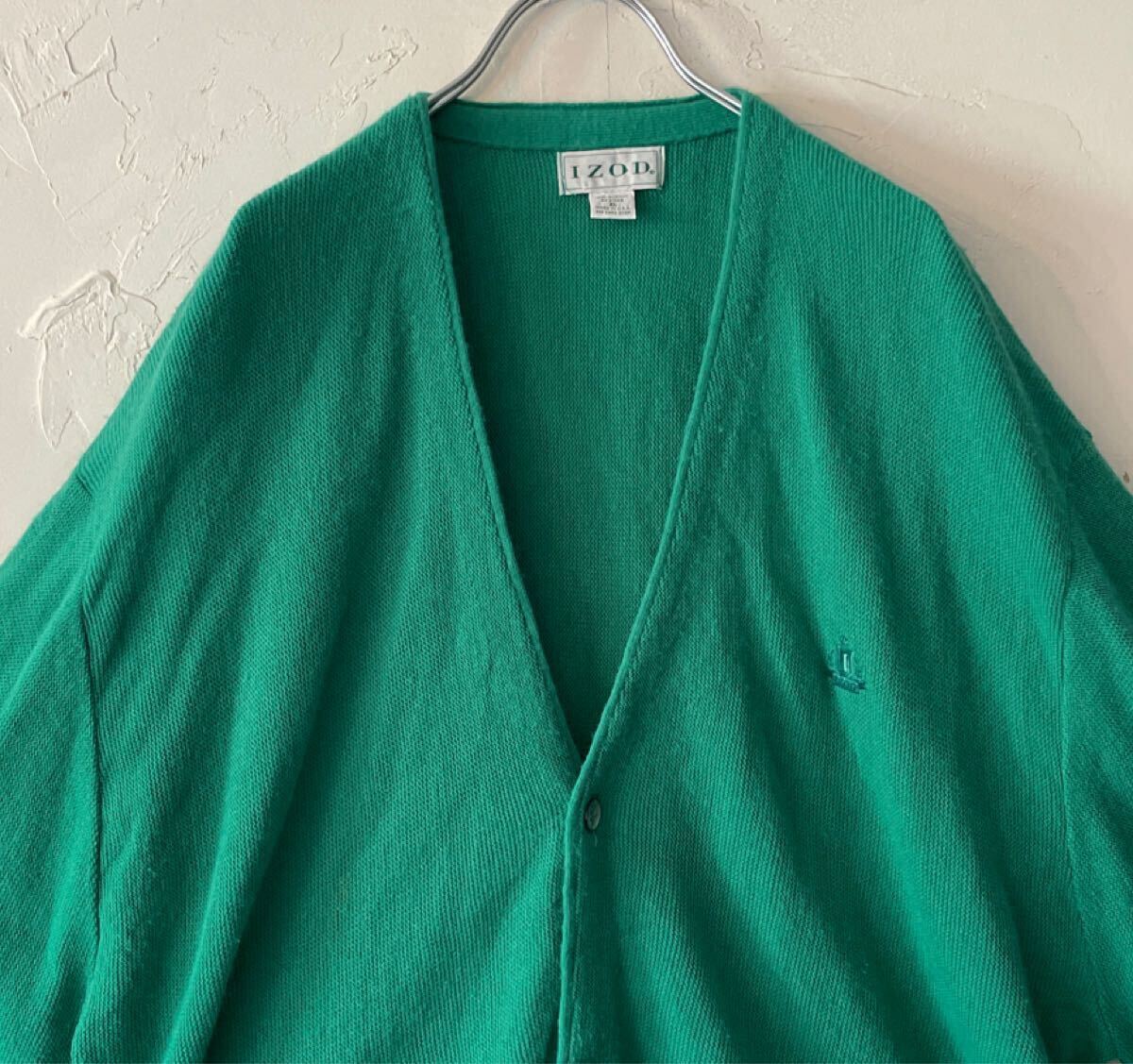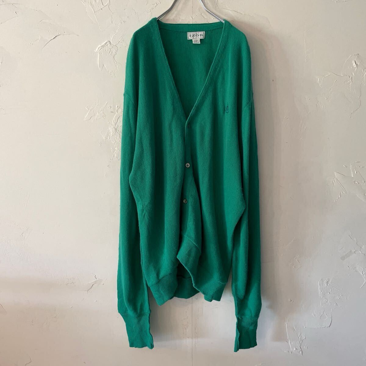 ヴィンテージ USA製 I ZOD ターコイズグリーン Vネック ロゴ刺繍 ニットカーディガン ロング袖丈 XL以上 オーバーサイズ メンズ古着になります。
