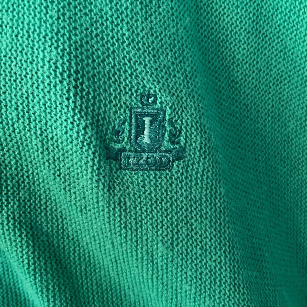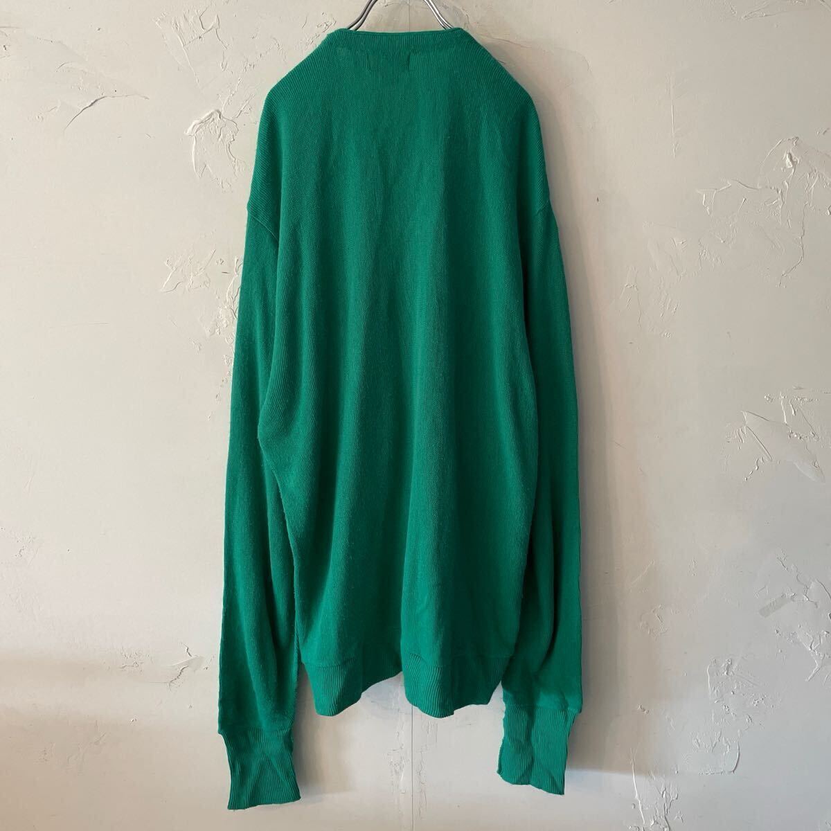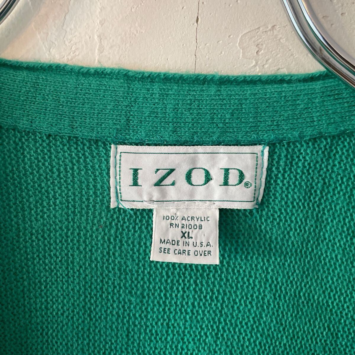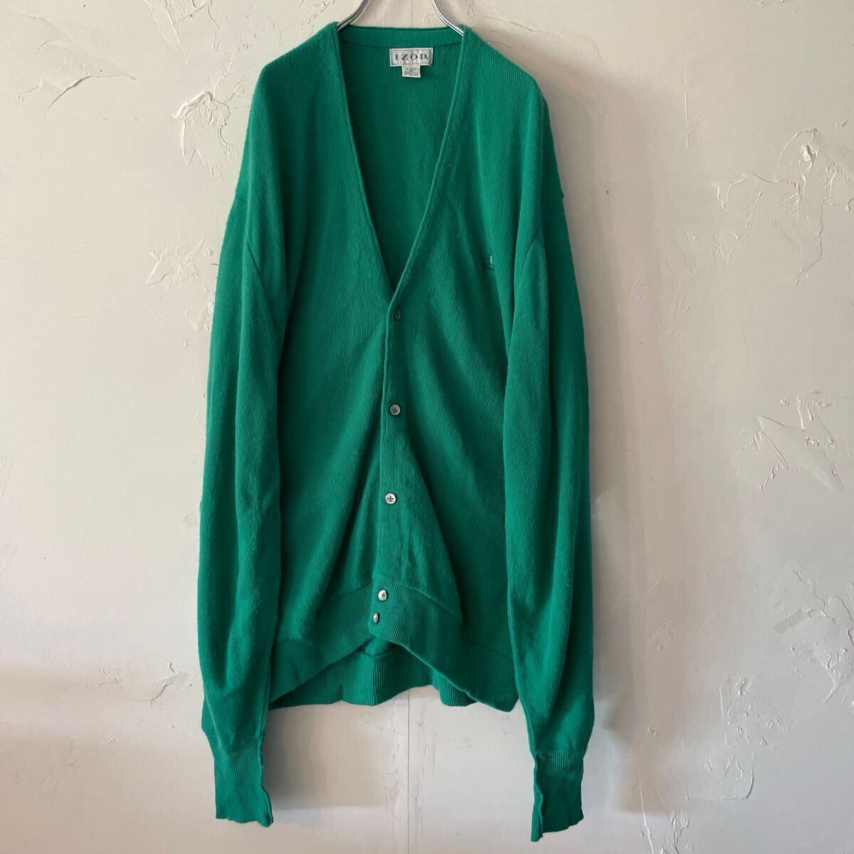ヴィンテージ USA製 I ZOD ターコイズグリーン Vネック ロゴ刺繍 ニットカーディガン ロング袖丈 XL以上 オーバーサイズ メンズ古着になります。