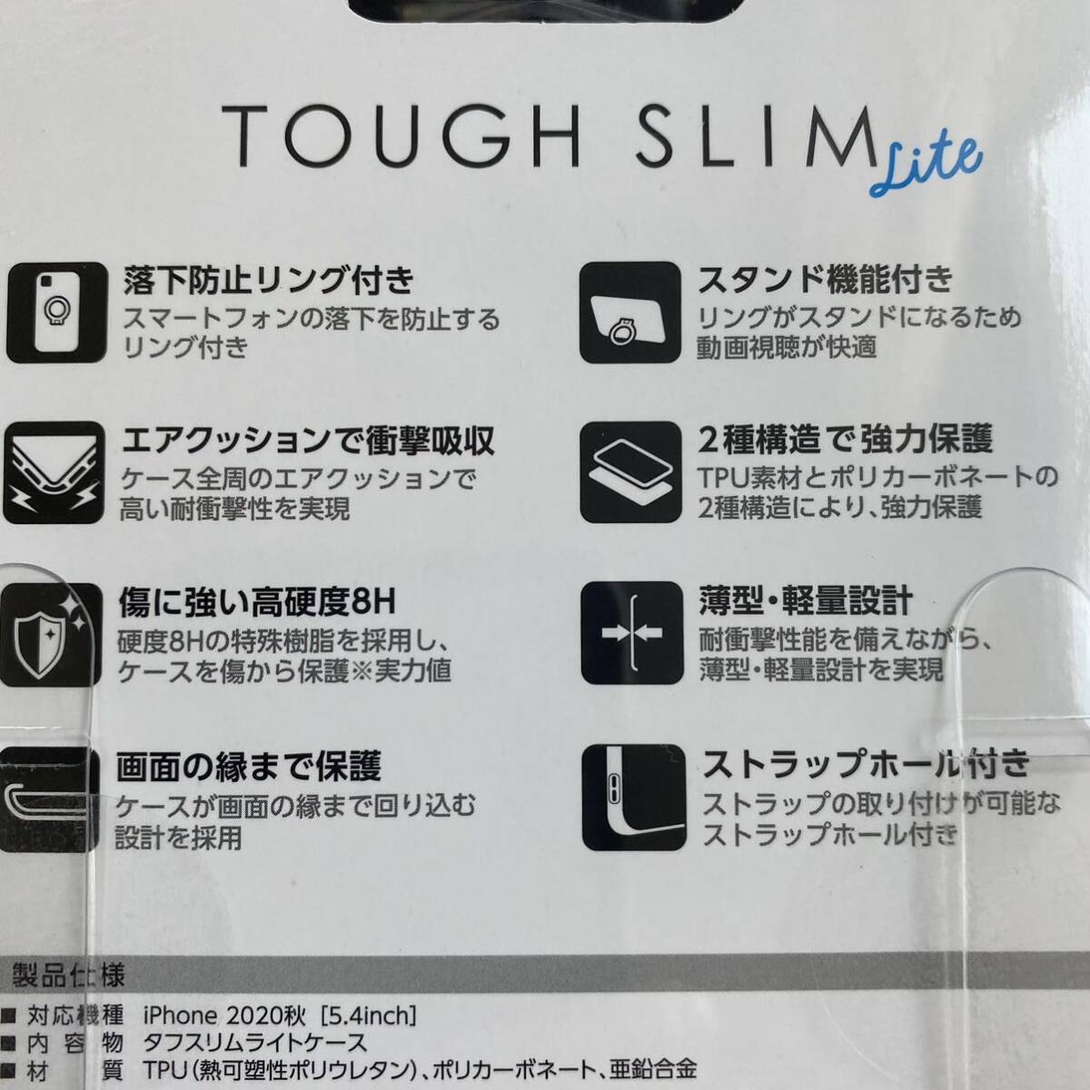 全周に配置した独自設計のエアクッションが衝撃を吸収し、背面には高硬度8Hの特殊樹脂を採用したiPhone 12 mini用TOUGH SLIM LITEケース。