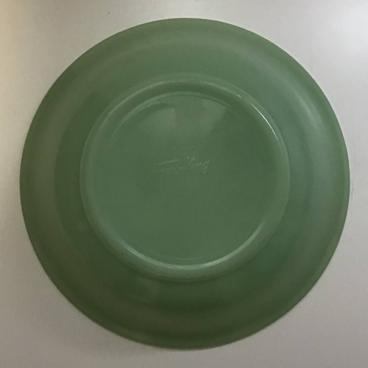 ・Fire-King のジェダイト食器は、リサイクルガラスの混合物を使用して作られています。緑色は、リサイクルされた緑色のガラス瓶を他の添加物とともに溶かして作られました。この工程により、Fire-King のジェダイト特有の緑色が生まれました。使用される緑色ガラスの量が異なるため、緑色の色合いが異なり、ガラスに渦巻き状の模様が見られる場合もあります。