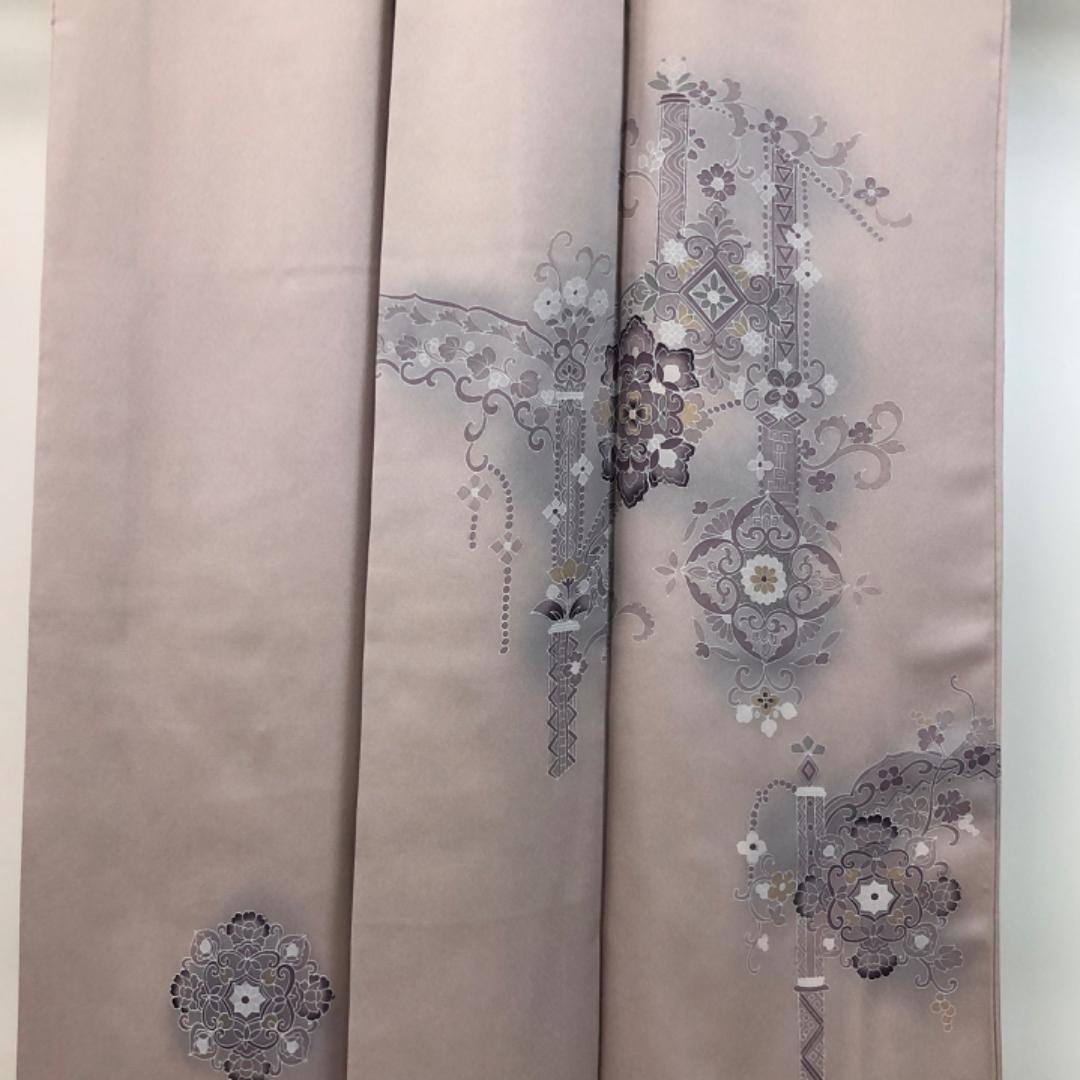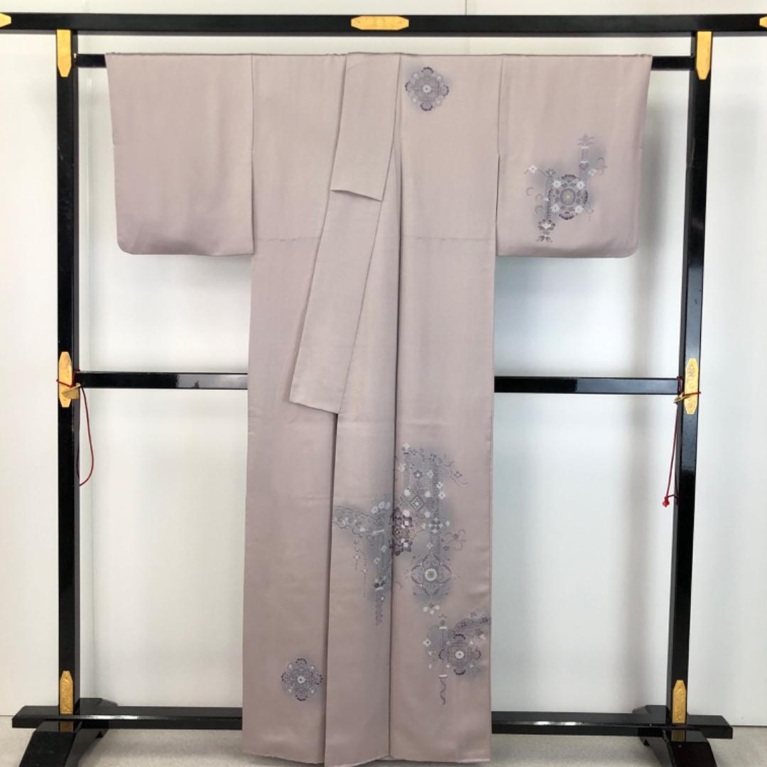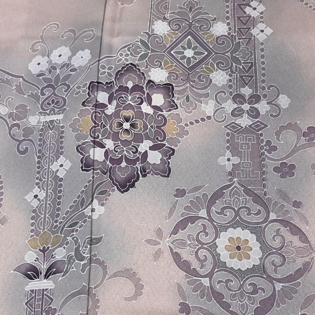 灰桜色のお色味に雰囲気の良い華柄模様、花唐草の柄裄がデザインされた素敵なお品でございます。