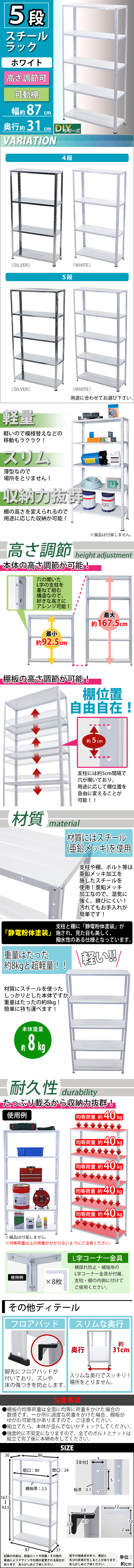 | 商品名 | 送料無料 5段 スチールラック ホワイト 粉体塗装 約幅87×奥行31×高さ92.5~167.5cm 高さ調節 スチール棚 スチールシェルフ オープンラック 収納ラック 収納棚 キッチンラック 工具棚 整理棚 保管 収納 家具 キッチン スリム 薄型 スチール 棚 ラック 白 5stlrs52wh |