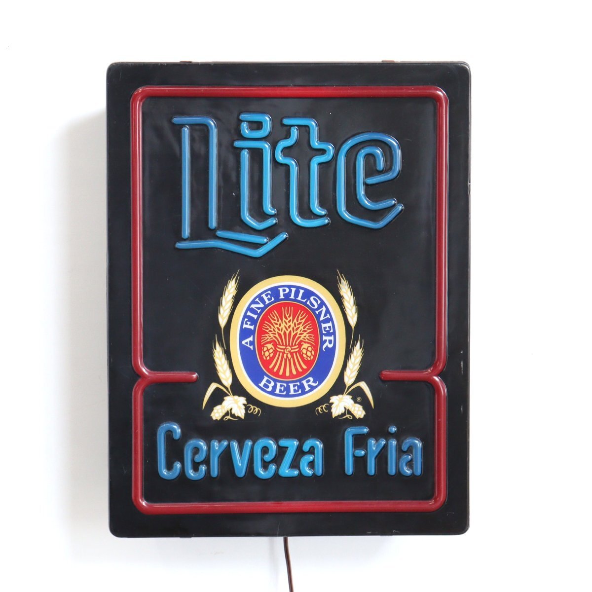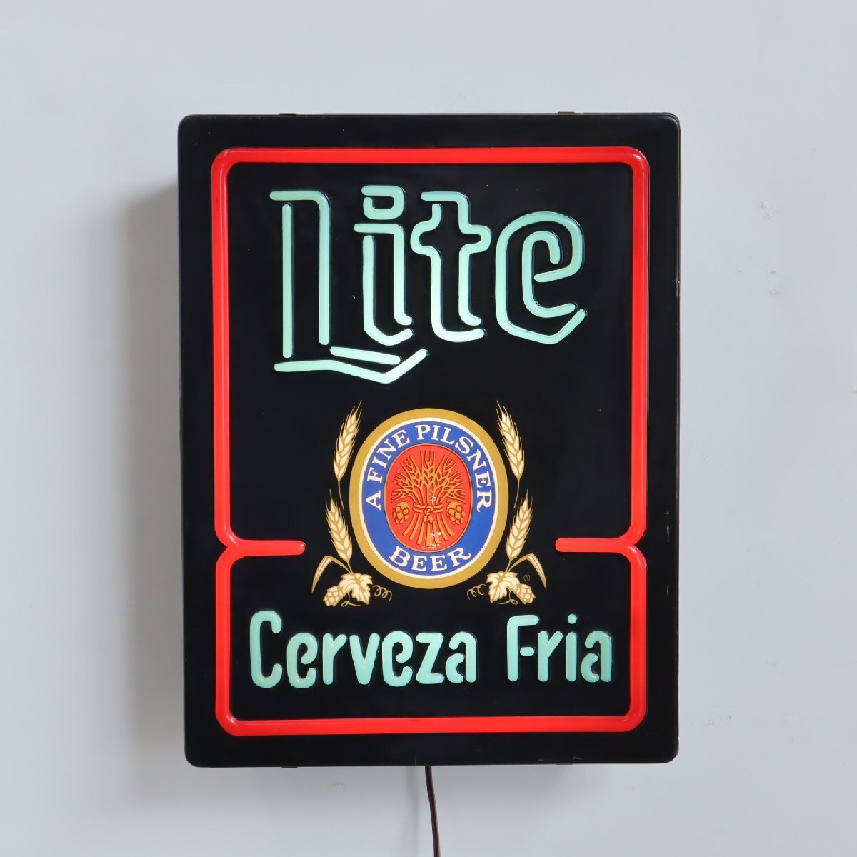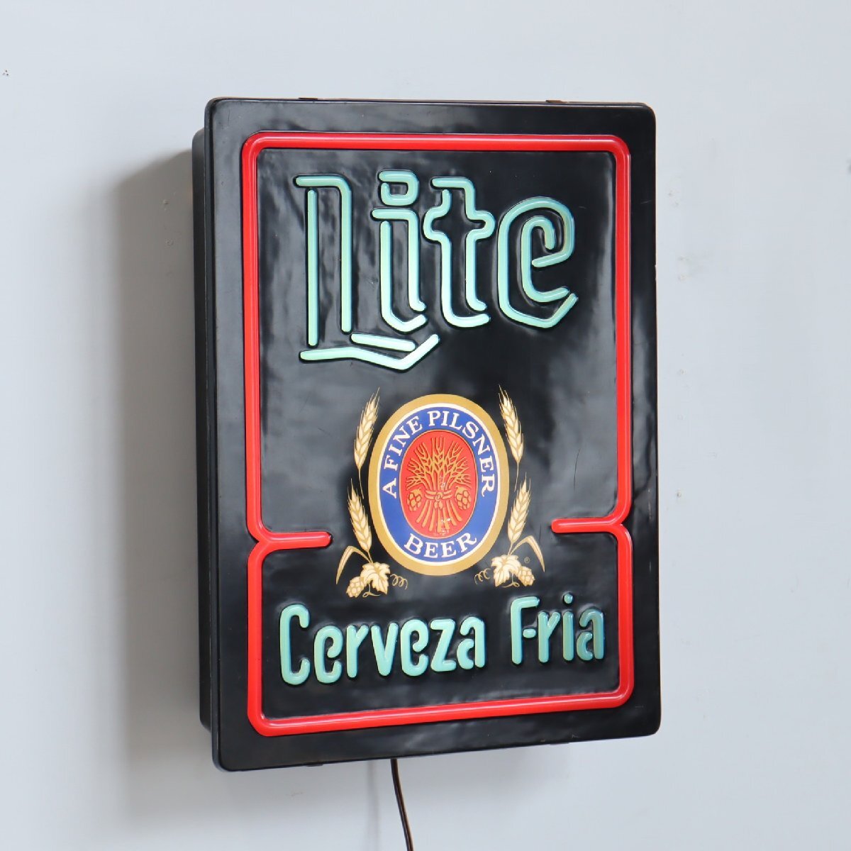 | 商品説明 explanation | 「Miller Lite Beer」のライトサインです。 ミラーライトは、1975年に全米で低カロリービールを発売し、2002年頃にはアメリカのビール市場の44%を占める程にまで人気が上がり続けていました。 そんな人気のあるミラーライトのコレクターズアイテムは、非常に人気なアイテムです。 お店の雰囲気づくりやガレージなどにいかがでしょうか。 電球は日本で市販されているLEDバーランプを使用しています。 |