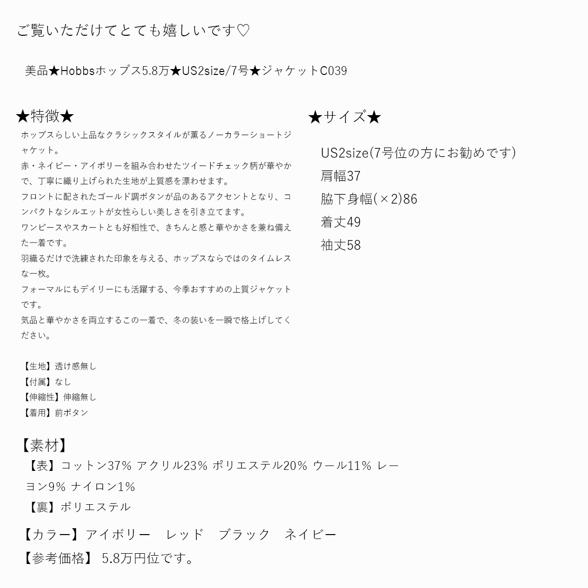 美品★素敵801★Hobbsホッブス5.8万★US2size/9号★ジャケットC039