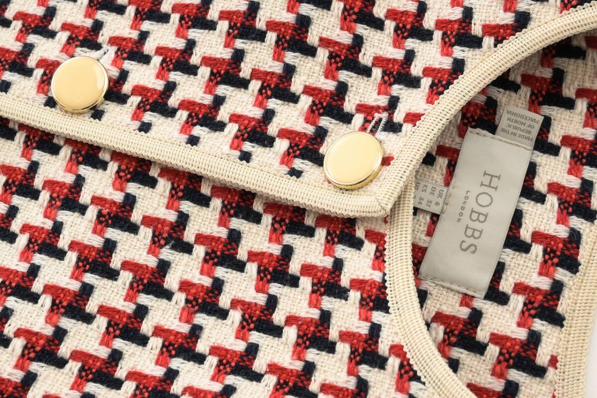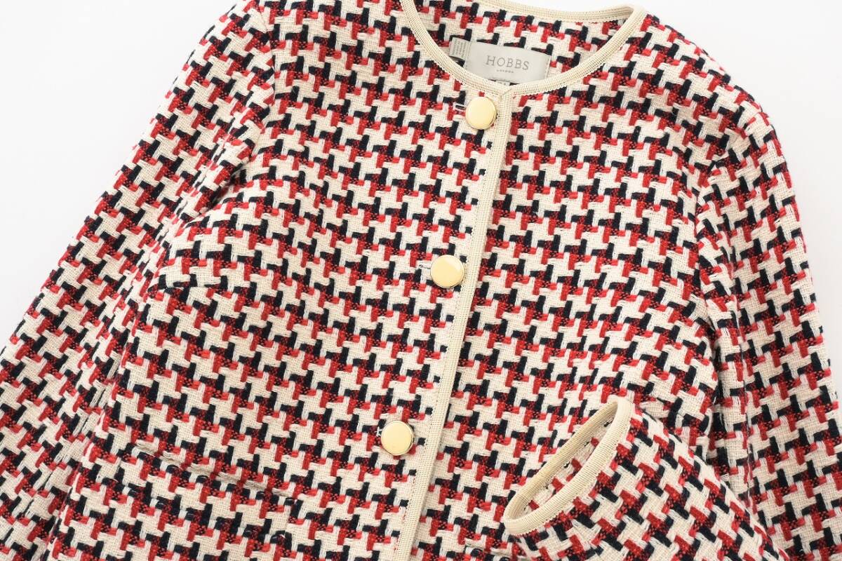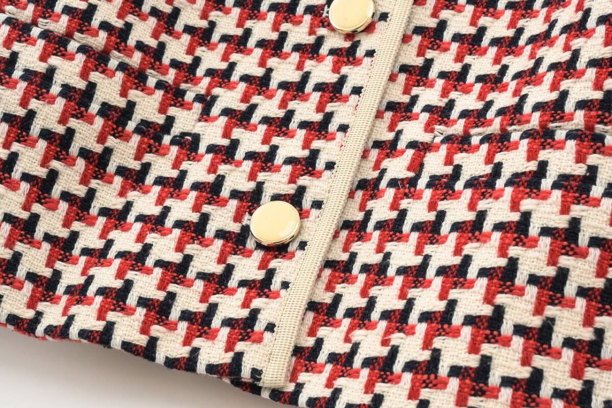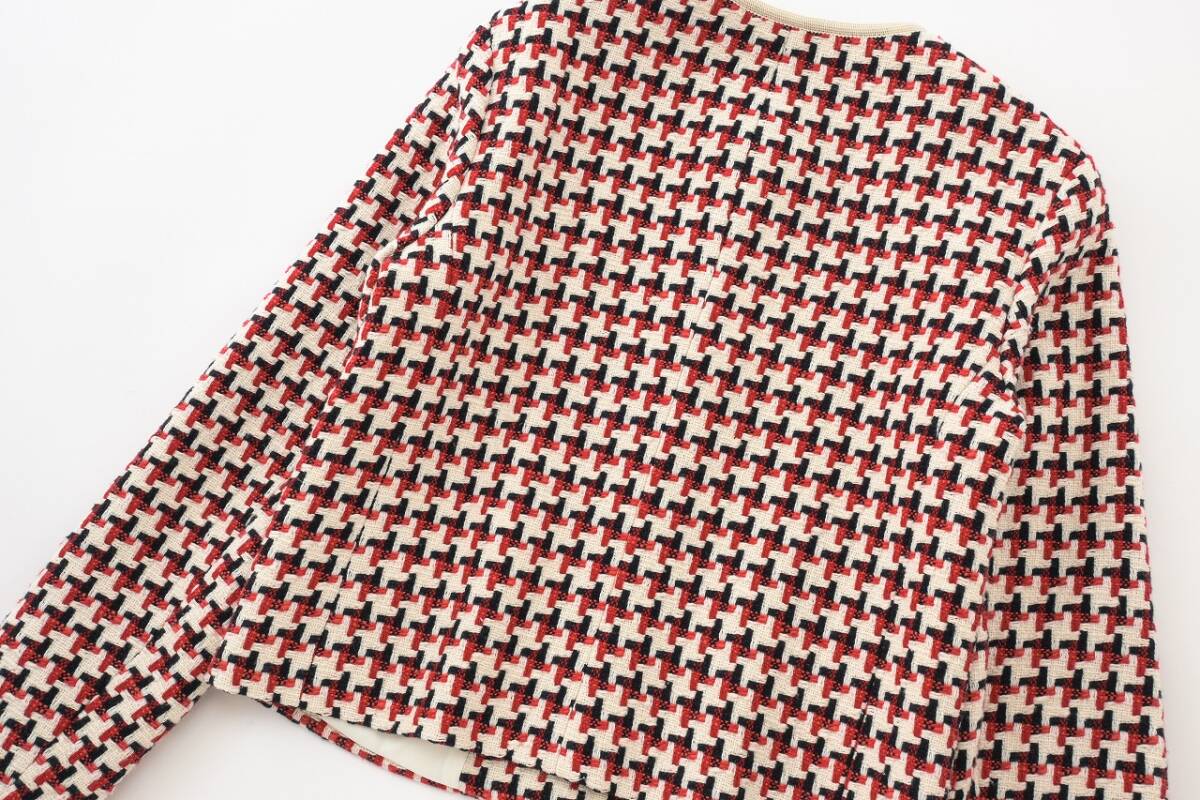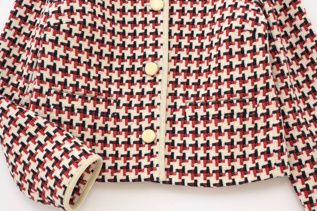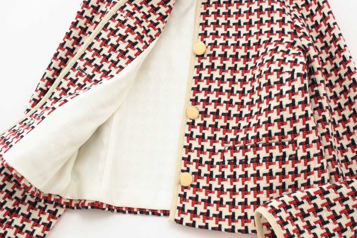 赤・ネイビー・アイボリーを組み合わせたツイードチェック柄が華やかで、丁寧に織り上げられた生地が上質感を漂わせます。
