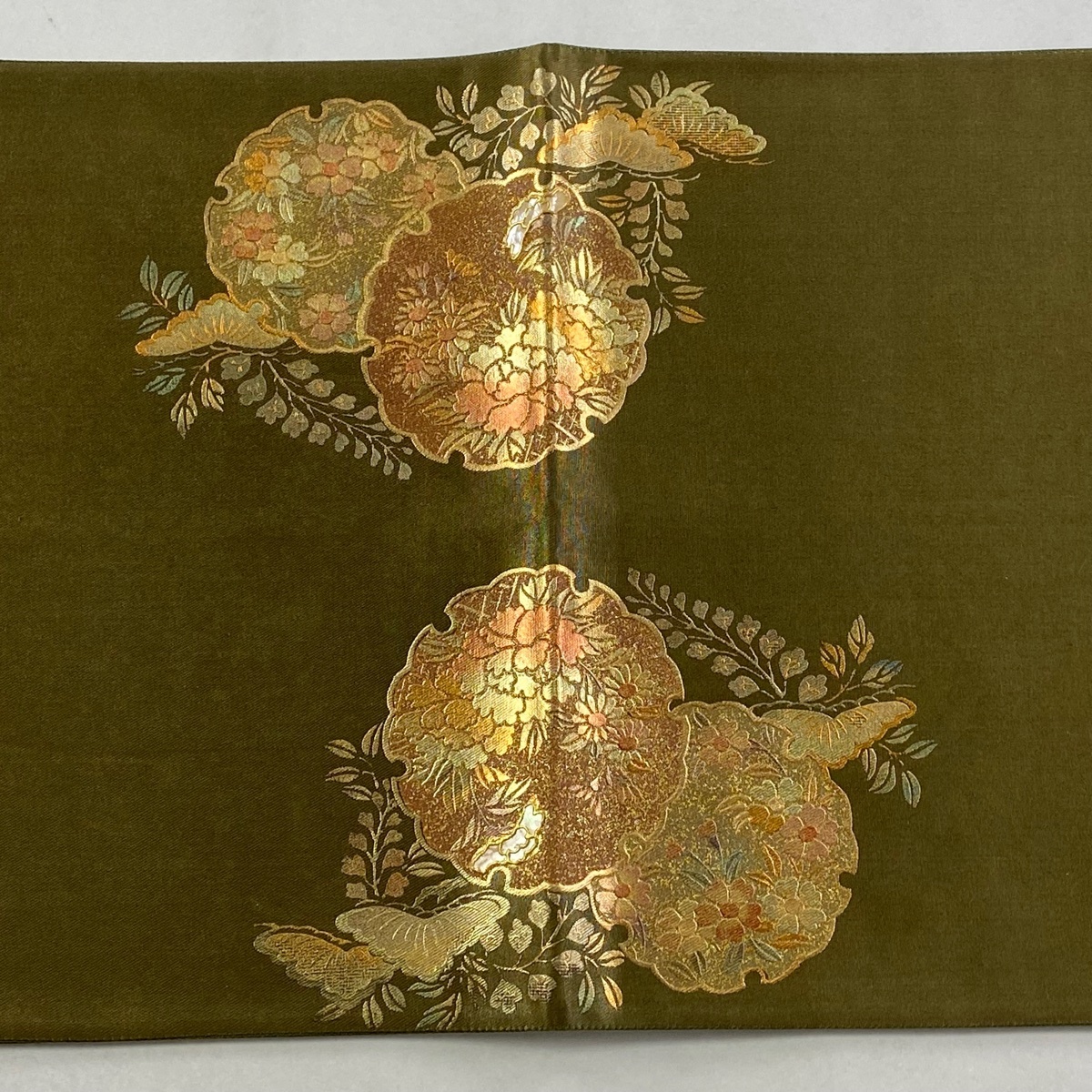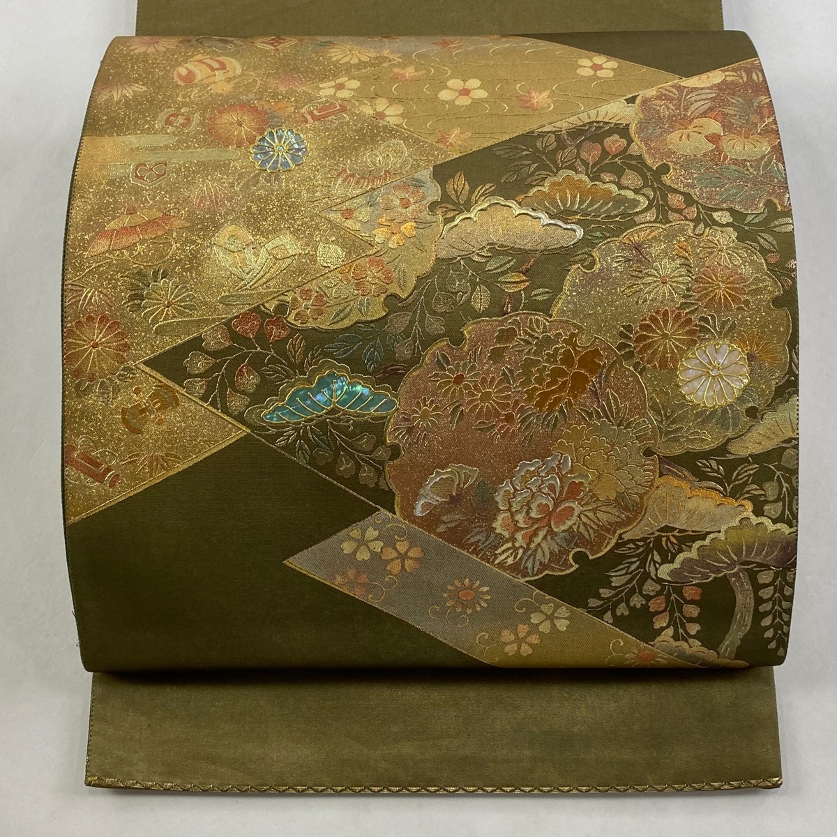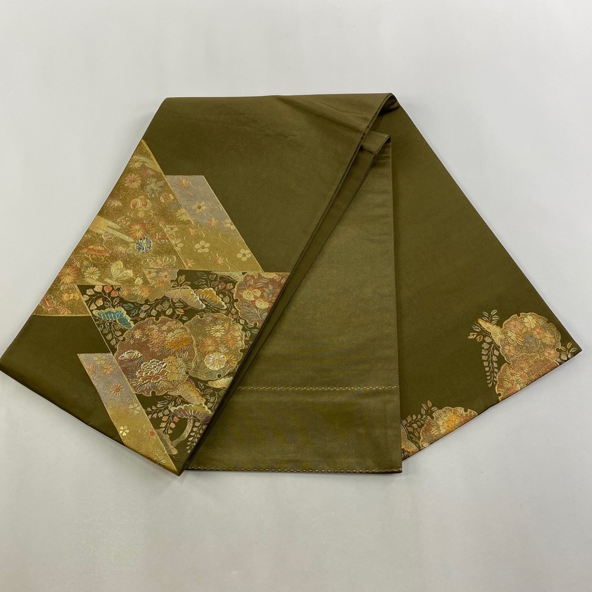 | 袋帯 美品 名品 雪輪 松竹梅 螺鈿 金彩 茶緑色 お太鼓柄 正絹 【中古】 |