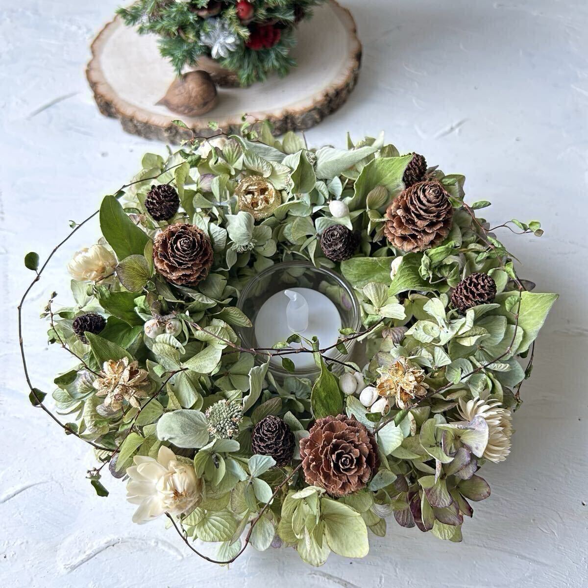 シックな色合いの紫陽花と木の実を使った冬のリースです…*
