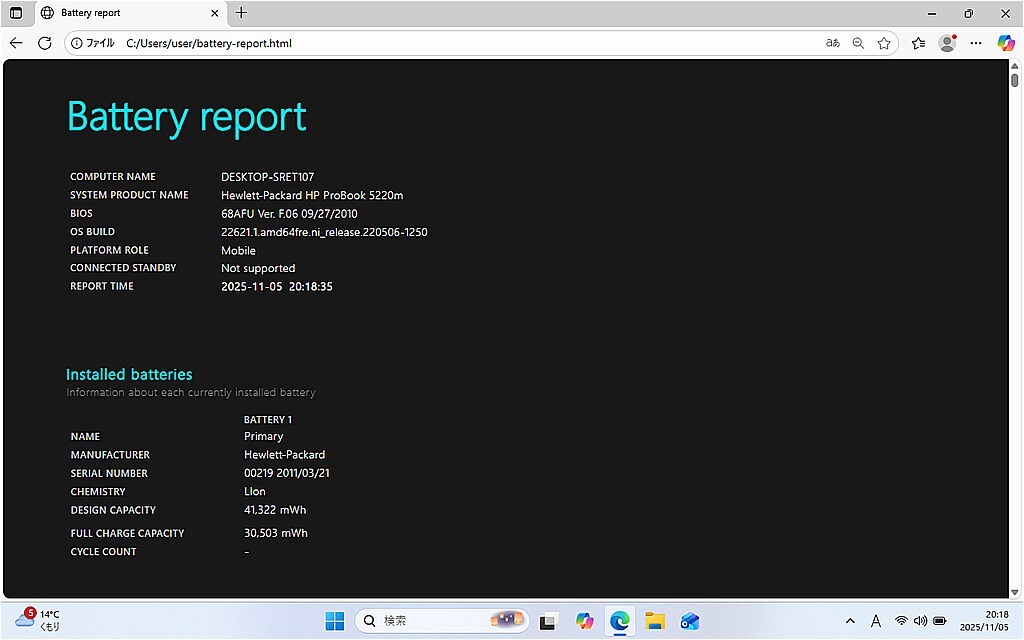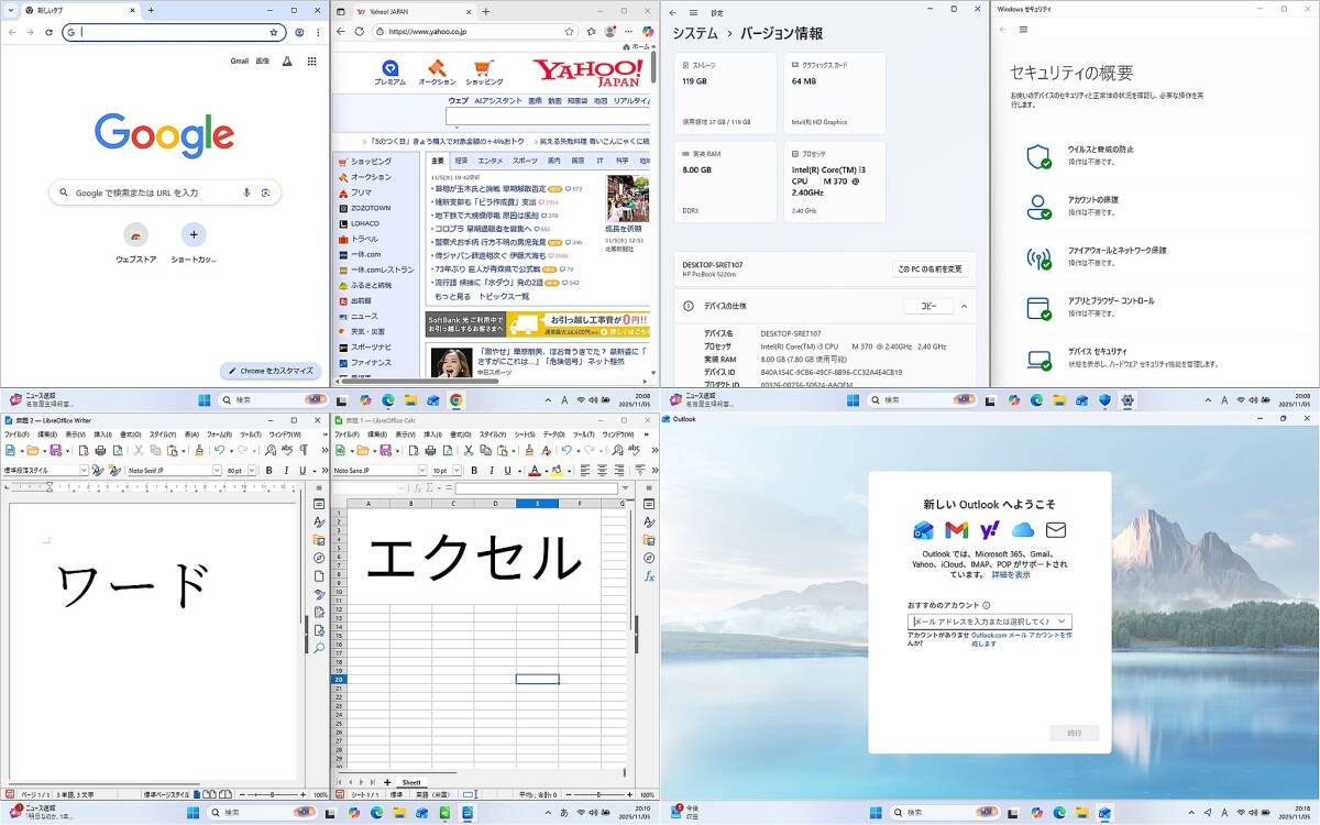 ※バッテリーの詳細は画像7、8を参照してください。 ※USEDという事で全体的に多少の使用感(キズ、テカリ、シール跡)はあります。 ※ACアダプターを抜いてしばらく起動させないと最初に電源を入れた時にスタンバイになり電源が切れたようになりますがもう一度電源ボタンを押せば大丈夫です。 ※フリーのオフィスソフト(LibreOffice)をインストールしてありますので、エクセルやワードも使えます。 ※マイクロソフトのセキュリティソフトも入ってます。 OS・・・Windows11HP CPU・・・Core i3-M370 2.4GHz SSD・・・128G メモリ・・・8G 光学ドライブ・・・非搭載 ディスプレイ・・・12.1インチ WXGA(1280x800) USB・・・3ポート(一ヶ所eSATAと共有) 有線LAN・・・搭載 無線LAN・・・搭載 メディアスロット・・・SDカード キーボード・・・文字テカリあります。 付属品・・・ACアダプター | ||||