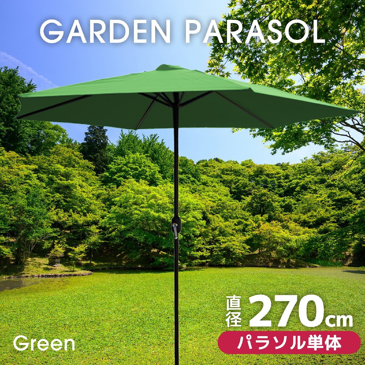 日差しから守るガーデンパラソルです。 バーベキューにピクニックにビアガーデンと晴れた日には欠かせないアイテム! ハンドル式で開閉が簡単! ハンドルをくるくる回るだけなので、女性でも簡単に傘を開くことができます。 パラソルの支柱は2つに分かれるので、持ち運びもラクラク! 水や汚れに強い撥水加工! 雨に濡れても水を弾くので、雨漏れする心配はありません!お手入れもサッと拭くだけで簡単! ※完全防水ではありません。 【商品仕様】 カラー:グリーン オープン時サイズ(約):幅2700×奥行2700×高さ2370mm 支柱径(約)直径40mm 重量(約):4.5kg 材質:ポリエステル、アルミ 【注意事項】 ・お客様による組み立て商品です。 ・強風時は破損、転倒などの危険がありますので、ご使用はおやめください。 ・傘生地には撥水加工をしておりますが、完全防水ではありません。 ・同梱されている説明書に一部誤りがございます。パラソル固定用のネジが2個と記載されていますが1個の誤りです。予めご了承ください。 |