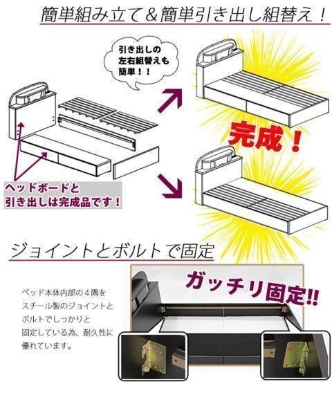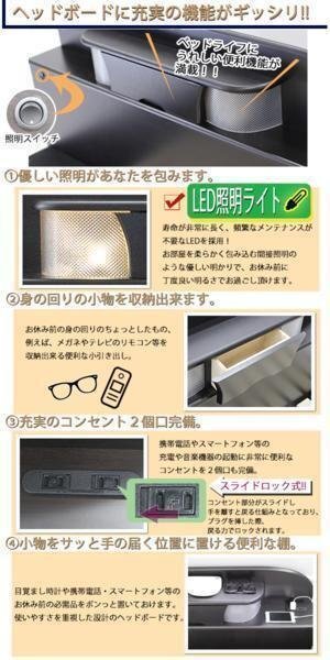 | 商品紹介 | ○大人気のベッドシリーズ!! ●ベッド下に大型収納の引き出しが2つ設置されています。 ●ヘッドボードにはLED照明ライト、電源コンセントを2個口、 小引き出しを完備。 ●桐のすのこを採用し、通気性も◎。 ●素材:MDF(ベッド本体) 桐(すのこ) LED(照明ライト) ●塗装:PU塗装 ●LED消費電力:5ワット ●電源コンセント(2個口):合計で1500ワットまで使用可。 ●電源コンセント用プラグが1本(長さ約170cm)と照明ライト用が1本(長さ約166cm)付属。 ●重量:約73kg ※こちらの商品は、組立て式です(組立てに必要な工具は付属しています)。 |