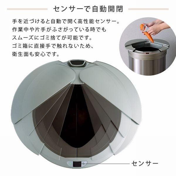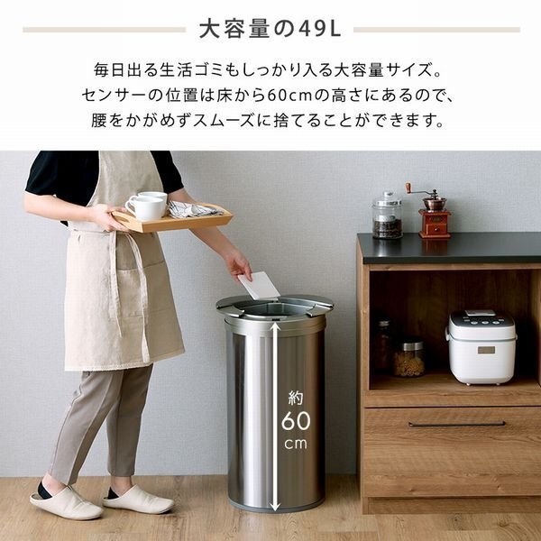 | 円形自動開閉ゴミ箱49L! 円形なので、インテリアに馴染むオシャレアイテムです。 横開きなのでニオイが漏れにくい仕様になっております。 センサー感知範囲を変えられるので、お好みの高さで調整頂けます。 ゴミ袋取付はストッパーに袋を巻きつけるだけで簡単設置です。 ステンレス製なので、錆びや汚れに強くお手入れが楽チンです。 |