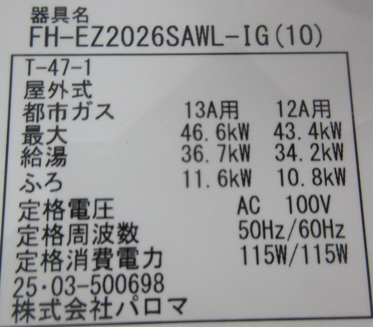 中古美品 25年製 リモコン付 パロマ エコジョーズ 都市ガス 給湯器 オート 追い焚き 20号 屋外壁掛 FH-EZ2026SAWL-IG(10) [9946]