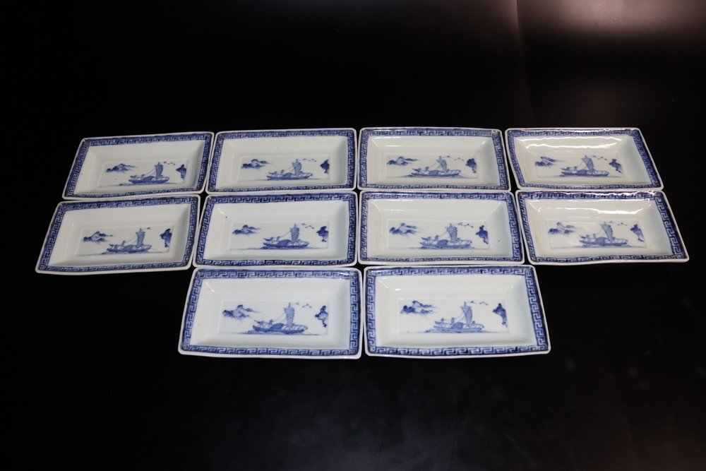 | 商品名 | 【江】時代 伊万里 成化年製銘 染付山水船雷文長皿 10客 10.5㎝×19㎝ 在銘 古美術品(銘々皿懐石料理道具)X1977 CTDBffii |
