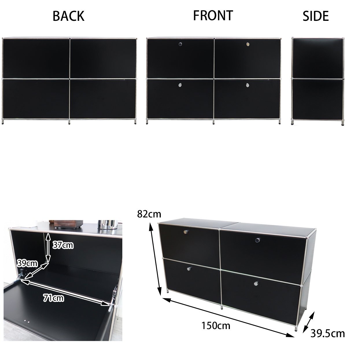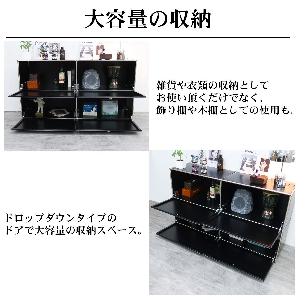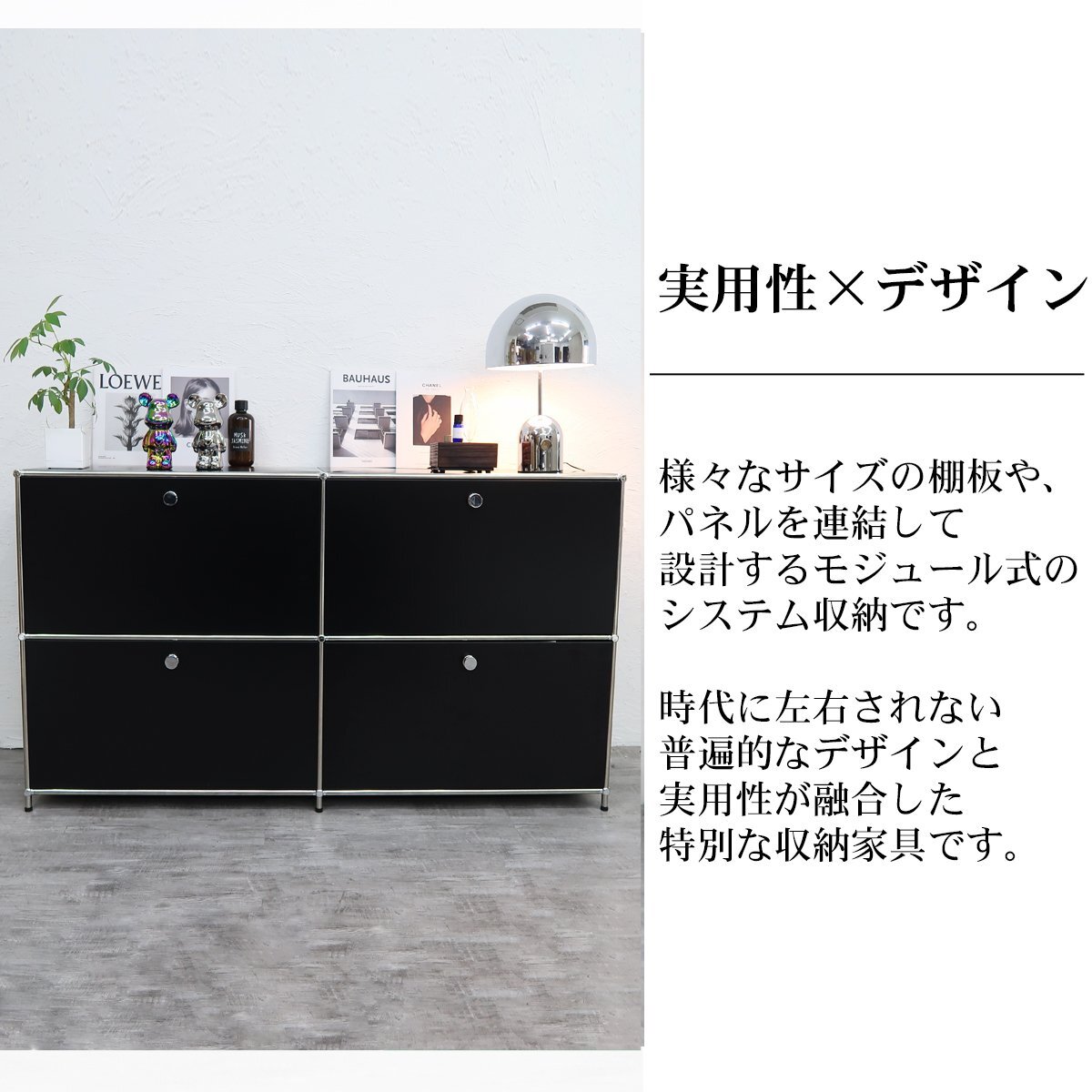 ![]() ※こちらの商品はリプロダクト品になります。 当店オリジナルのデザイン収納「Module(モジュール)」 当店人気のリプロダクトハラー(HL-品番)を販売以来、多くのお客様からご要望を頂いていた 「組み立て簡単」で「手軽に購入出来るハラーが欲しい」との声にお応えし、 スタッフ一同で長い試作期間を設けた末に販売出来る運びとなった当店オリジナルの収納家具です。 見た目の違いはあれど、デザインを崩さない事に重視し、 組み立てのしやすさや収納としての使い勝手の良さにもこだわって製作した末、 誕生したのがこの「Module(モジュール)」です。 ドロップダウンドアが4つ付いた2連2段のサイドボード。 一つの棚の内側は、A4ファイルを縦にしても横にしてもぴったり収納できる高さと奥行で、 平置きでは3つ並べて置くことができる幅があります。 ドロップダウンドアはソフトクローズシステム仕様 通常の仕様ではドアを閉じる際に大きな音がしますが、 ソフトクローズシステムは8割程閉じた時点でゆっくりと静かに自動で吸い込むようにドアが閉まります。 リビングルームやワークスペースなど幅広い場所で活躍する、使い勝手の良いサイズです。 USMハラーとは・・・ 『スイスに拠点を置く「USM(ユーエスエム)」社が手掛ける「USMハラー」は、チューブとボール、 パネルを連結して設計するモジュール式のシステム収納です。 オフィスの収納システム、主に書類や書籍の収納家具としてスタートした USMハラーですが、今では一般家庭にも広まりました。』 サイズ(約):幅150cm×奥行き39.5cm×高さ82cm(アジャスター引き伸ばし時、84cm) 重量(約):41kg 材質: ・フレーム:スチール(クロムメッキ) ・パネル:スチール(パウダーコーティング) カラー:グラファイトブラック 注意事項 |