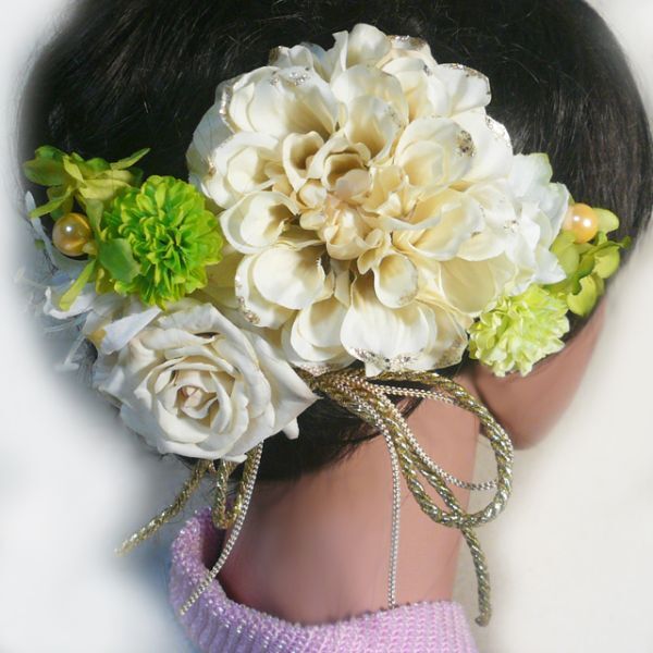 花 髪飾り ラメダリアbeと小花 淡茶白緑 結婚式 成人式 卒業式 かんざし